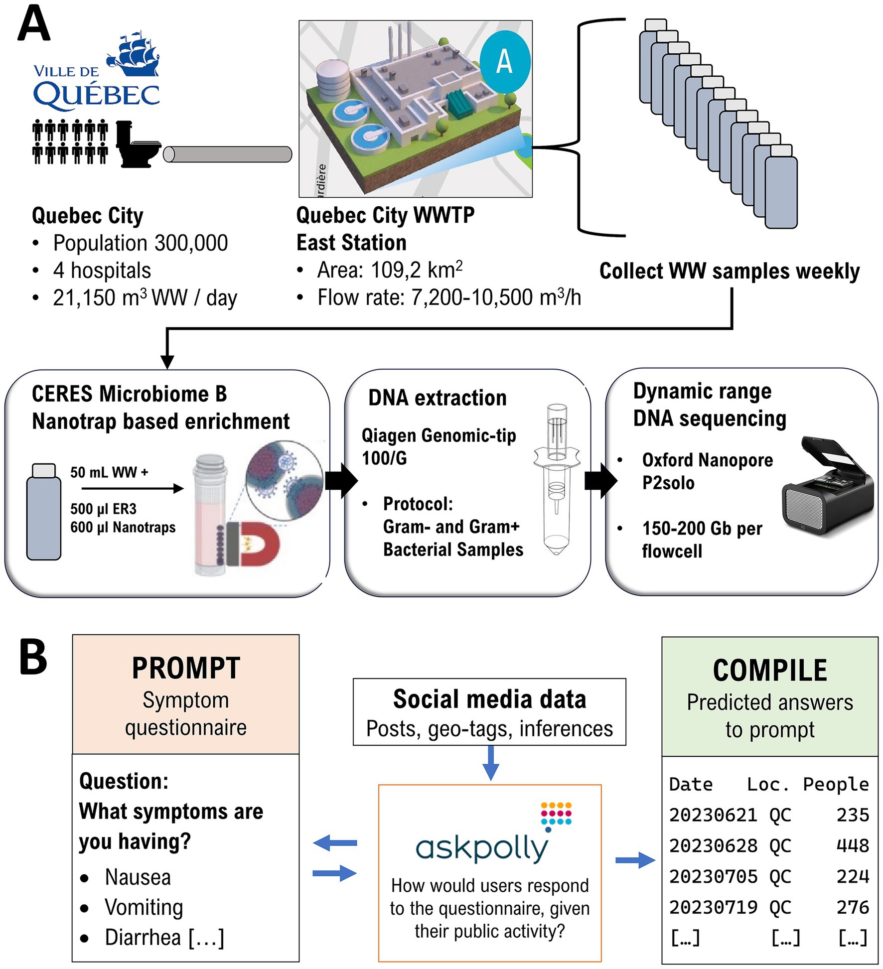 Figure 1. Joint workflow for continuous wastewater metagenome nanopore sequencing (A) and community-based AI-driven inferences (B). WW, Raw wastewater; WWTP, Wastewater treatment plant; P2solo, Oxford Nanopore PromethION 2 solo portable DNA sequences.
