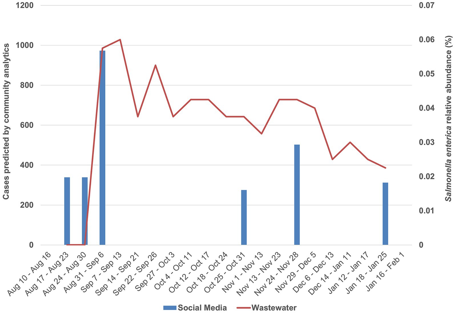 Figure 2. AI-driven community analytics for Salmonella symptoms overlap with metagenomic tracking of Salmonella enterica. Blue bars indicate community analytics with number of people reporting symptoms on the left axis. Missing blue bars are points below 100, which were considered too few to guarantee “Experiencing” social media users’ anonymity and were not reported by AskPolly. These can be interpreted as “less than 100”. The red line indicates wastewater pathogen measurement (expressed as percentage of all sample read counts), with relative abundance on the right axis.