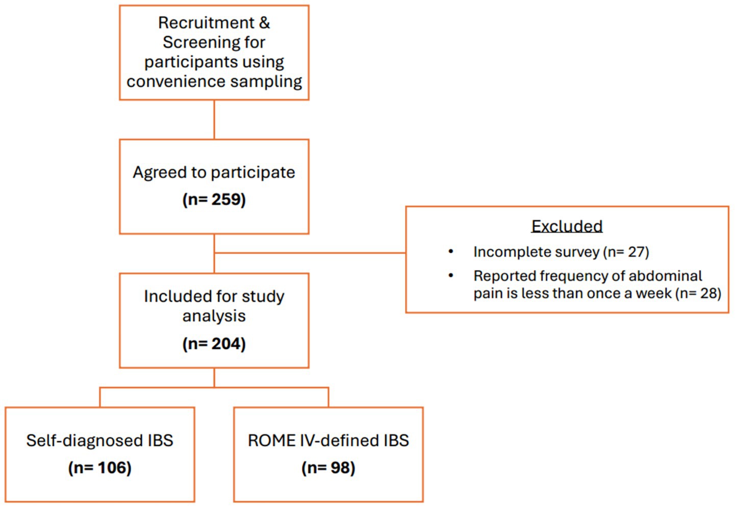 A total of 259 individuals agreed to participate in the study, of which 204 were considered eligible for inclusion. Of the eligible participants, 106 (52%) self-diagnosed IBS symptoms and 98 (48%) were diagnosed with IBS based on the Rome IV criteria questionnaire. The flowchart of the study recruitment process is illustrated in Figure 1.