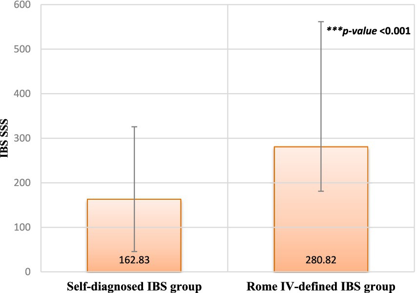 Figure 2 presents the difference in IBS-SSS between the two groups. Participants diagnosed with IBS based on the Rome IV criteria exhibited significantly higher severity scores than individuals who self-diagnosed as having IBS (p < 0.001).