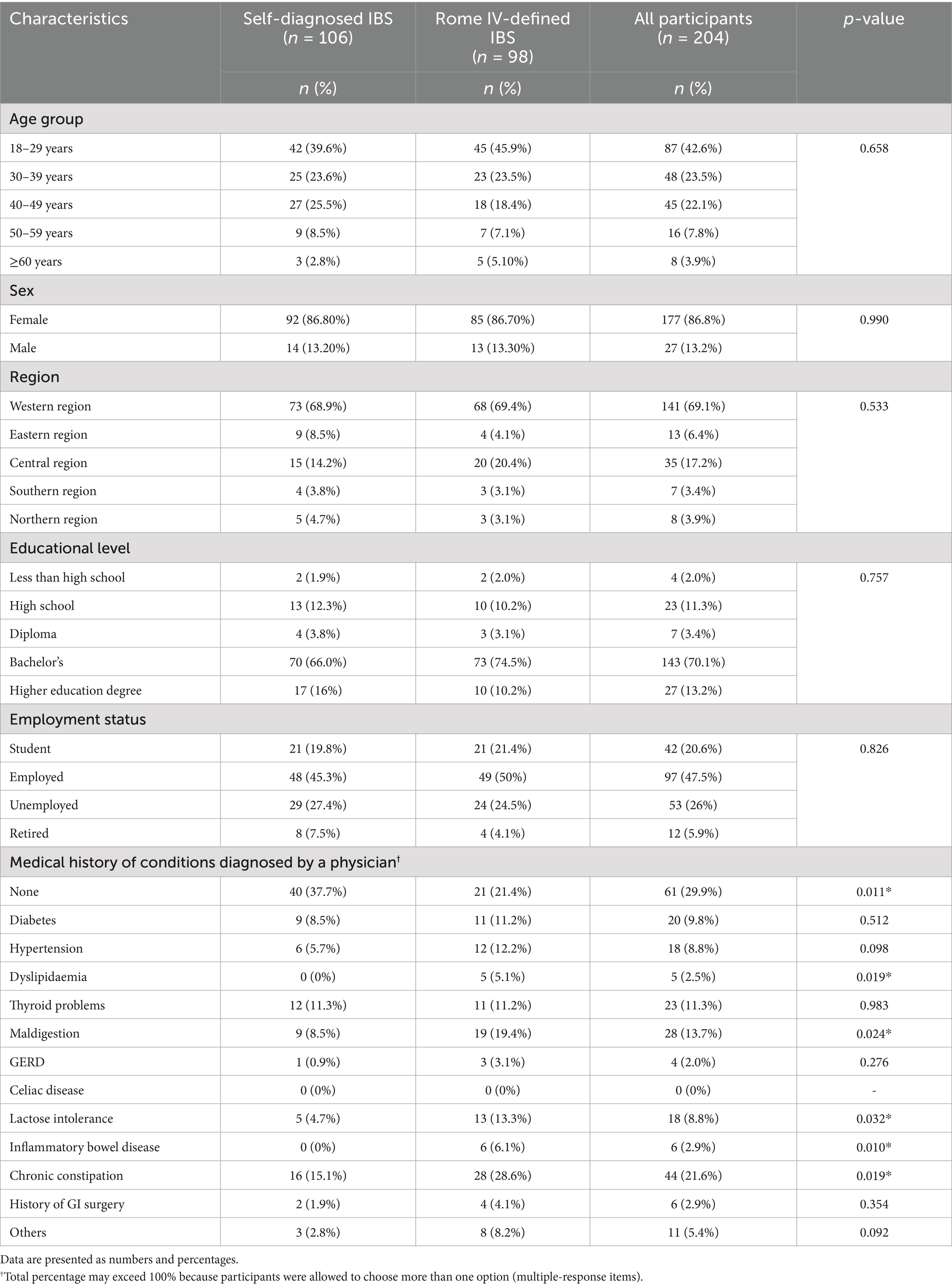 Methods: This cross-sectional study included 204 adults, 106 (52%) with self-diagnosed IBS and 98 (48%) with Rome IV-defined IBS. All participants completed a questionnaire assessing sociodemographic characteristics, IBS diagnosis (using Rome IV criteria), IBS symptom severity scale (IBS-SSS), and eating patterns.