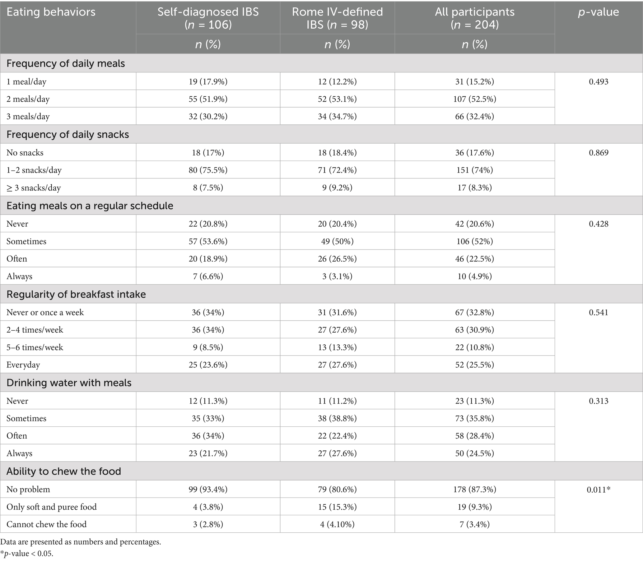 The frequency of most eating behaviors did not differ significantly between the two groups. They showed similar trends in the regularity of eating meals and breakfast intake. The proportion who do not eat meals on a regular schedule was 20% in each group, while the proportion who do not eat breakfast or only eat it once a week was 34% in the self-diagnosed IBS group and 31.6% in the Rome IV IBS group. However, the ability to chew the food differed significantly between groups (p < 0.05). The Rome IV IBS group was more likely (15.3%) to prefer soft and pureed food for chewing than the self-diagnosed IBS (3.8%). The eating behaviors of both groups are compared in Table 2.