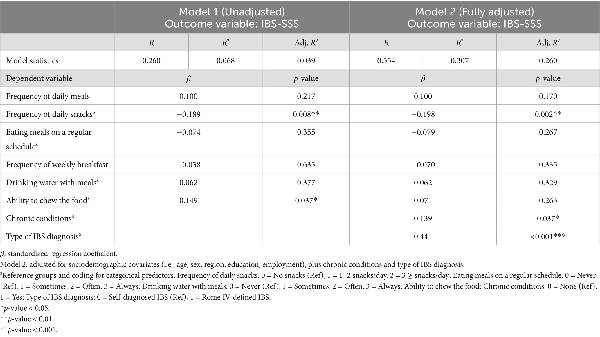 To explore the relationship between eating behaviors and IBS-SSS (outcome variable), multiple linear regression analyses were conducted. The first model (Model 1) included only dietary behavior variables: number of main meals per day, frequency of daily snacking, regularity of meal patterns, frequency of breakfast consumption per week, water intake during meals, and chewing ability. Model 2 extended the analysis by adjusting for sociodemographic factors as well as clinical variables, including the presence of chronic conditions and type of IBS diagnosis.