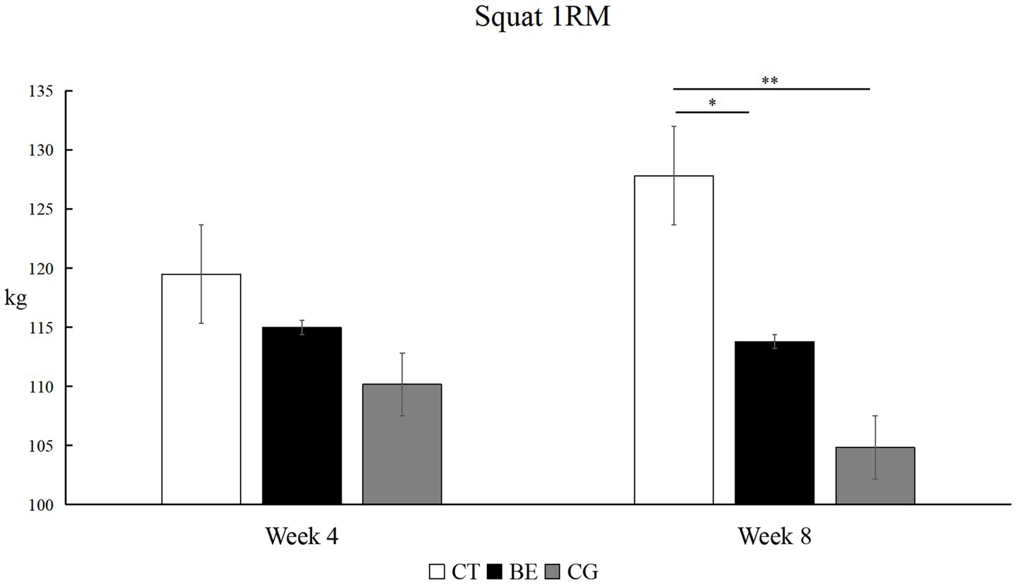 As shown in Figure 6, between-group comparisons of back squat 1RM showed no significant difference after 4 weeks (F = 1.517, p > 0.05), with a small effect size (η2 = 0.126, 95% CI [0.000, 0.387]). However, after 8 weeks, the between-group difference became highly significant (F = 8.611, p < 0.01), with a large effect size (η2 = 0.451, 95% CI [0.108, 0.642]). Post hoc tests demonstrated that the CT group had a significantly greater 1RM than both the BE group (p < 0.05) and the CG (p < 0.01). No significant difference was observed between the BE and CG groups (p > 0.05).