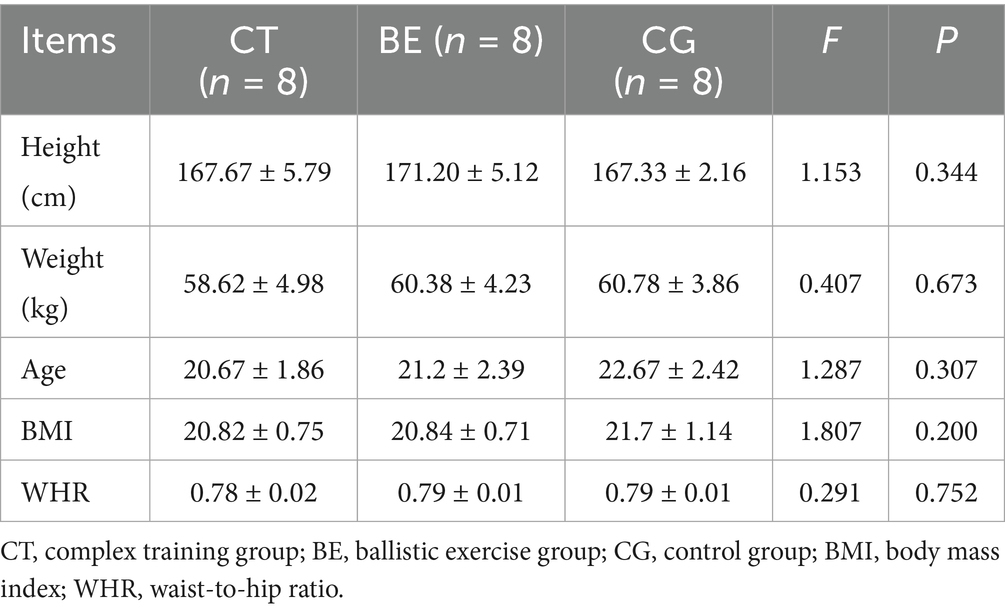 All participants continued their standard physical and technical training schedules under the supervision of their team coaches throughout the eight-week intervention. Baseline statistical tests confirmed no significant differences in anthropometric variables, age, or other key indicators among the three groups (p > 0.05; see Table 1).
