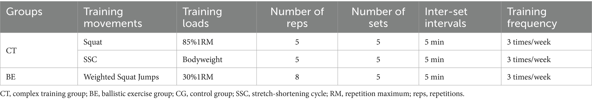 Traditional strength training methods, while effective in enhancing basic strength, demonstrate limited transfer to sport-specific explosive actions (4). To address this limitation, researchers have explored targeted methods such as complex training (CT) and ballistic exercise (BE). CT integrates high-load resistance training with rapid stretch-shortening exercises, spanning the force–velocity spectrum to enhance both strength and power (5, 6). Previous studies have shown that training 2–3 times per week for 6–10 weeks (7), and specifically 8 weeks (8), produces significant improvements in sprinting and vertical jump performance. BE, by contrast, involves accelerated movements through the entire concentric range, often with load release at the endpoint (9–11), and typically employs lighter loads to maximize high-velocity force production (12). This approach has been widely applied in sports requiring explosive lower-limb actions (13).