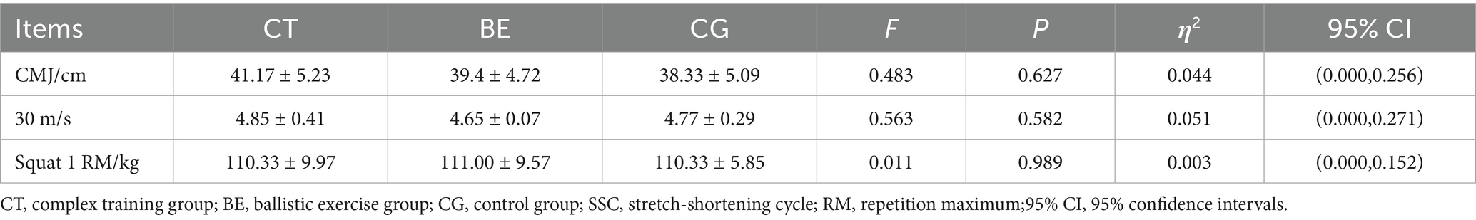 As shown in Table 3, the baseline athletic performance data for the three groups (CT, BE, and CG) prior to the experimental intervention. A one-way ANOVA revealed no statistically significant differences between the groups in countermovement jump (CMJ) height (F = 0.483, p = 0.627), 30-meter sprint time (F = 0.563, p = 0.582), or 1-repetition maximum (1RM) squat strength (F = 0.011, p = 0.989). The associated effect sizes (η2) were small, and their 95% confidence intervals all included zero, further confirming the lack of meaningful baseline differences. This establishes that the groups were equivalent in terms of lower-limb explosive strength and maximal strength before the training period, ensuring that any subsequent changes in these measures can be attributed to the differential effects of the training interventions.