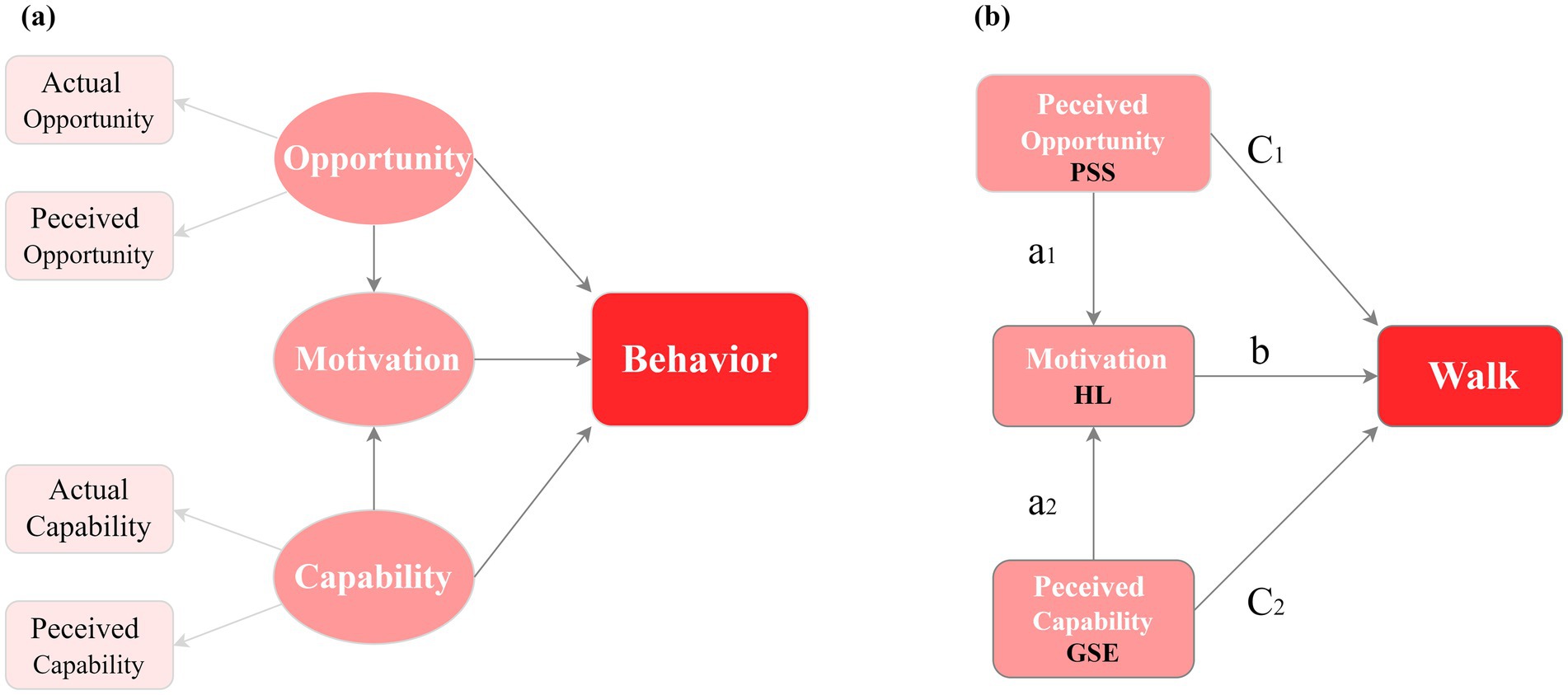 Previous studies have confirmed that motor skills (13) and social support (14) significantly improve physical activity levels. Nonetheless, no research has explored how perceived capability and perceived opportunity affect HL and walking of patients with chronic diseases from a sociopsychological perspective grounded in the COM-B model. General self-efficacy (GSE) is a person’s belief in their own abilities (15). It is about how people see their skills from a psychological view and is linked to Capability in the COM-B model. Perceived social support (PSS) refers to an individual’s perceived level of accessible social capital (16). PSS reflects perceived opportunities to practice health-related behaviors. Previous research has confirmed that GSE and PSS enhance HL and physical activity (15, 17–21). We speculate that PSS may encompass perceived opportunities for walking; GSE may encompass perceptions of one’s walking-related abilities; and HL may encompass knowledge of the benefits of walking, intention, and motivation to walk. This study uses the COM-B framework to hypothesize that PSS (seen as opportunity), GSE (seen as capability), and HL (linked to motivation for walking) all help patients with chronic diseases walk more. PSS and GSE affect the walking behavior of patients with chronic diseases through HL (Figure 1B).