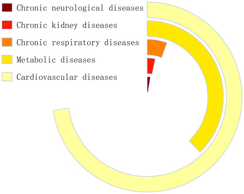 The study population comprised adult patients diagnosed with chronic diseases in the PBICR. Inclusion criteria: Patients with chronic diseases for which moderate-intensity physical activity is recommended as a symptom management strategy by guidelines or expert consensus. Patients with cardiovascular and cerebrovascular diseases (e.g., hypertension and coronary heart disease), metabolic disorders (e.g., diabetes, fatty liver disease, and dyslipidemia), chronic respiratory diseases (e.g., chronic obstructive pulmonary disease and asthma), chronic neurological disorders (e.g., Alzheimer’s and Parkinson’s diseases), and chronic kidney disease were included. The exclusion criteria were chronic diseases (chronic gastritis and chronic enteritis), which did not include walking as a symptom control and improvement intervention in the guidelines. Some tumors have also been included in the category of chronic diseases for management. There are differences in symptom management methods for patients with tumors at different stages. Patients with early- or mid-stage cancer might benefit from exercise to help their immune system. However, this may not be suitable for those with late-stage cancer. Patients with tumors were excluded because this study did not investigate the treatment period for those patients. Some participants simultaneously suffered from multiple chronic diseases. The study could not analyze the samples by weight because there was no information on the gender, age, or location of people with multiple chronic diseases in 2021. A total of 1,550 patients with one or more chronic diseases were enrolled. Among them, 1,128 had cardiovascular disease, 586 had metabolic disease, 39 had chronic neurological disease, 51 had chronic kidney disease, and 86 had chronic respiratory disease (Figure 2). The findings are most generalizable to patients with cardiovascular and metabolic conditions.
