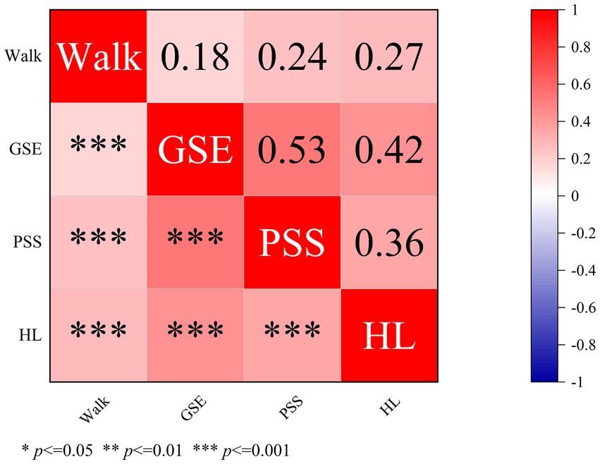 Figure 3 shows the relationships between the PSS, GSE, HL, and walking. The results showed that GSE, PSS, and HL were all associated with walking behavior. HL had the strongest link (r = 0.27, p < 0.001), followed by PSS (r = 0.24, p < 0.001) and GSE (r = 0.18, p < 0.001). GSE and PSS showed a moderately significant positive correlation with HL, with GSE showing a higher correlation with HL (r = 0.42, p < 0.001) than PSS (r = 0.36, p < 0.001).