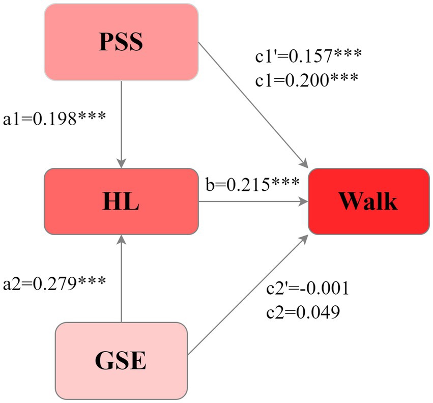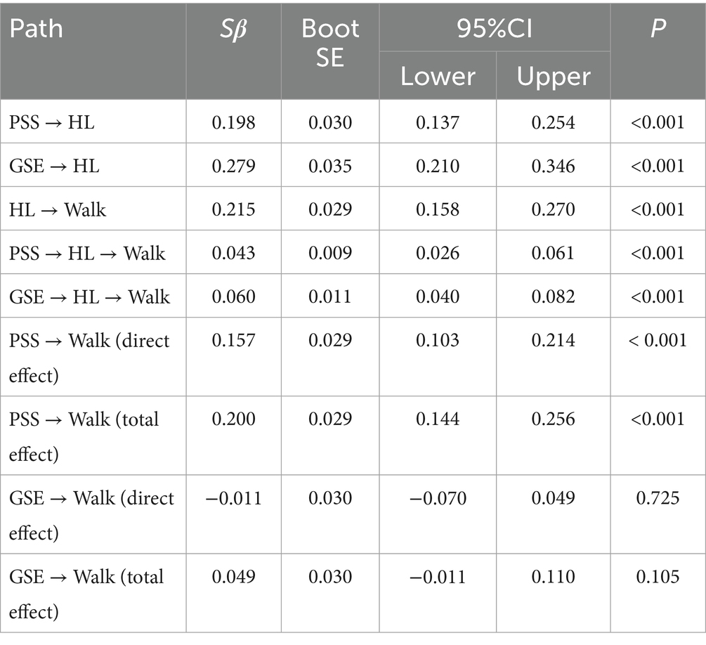 Results: HL (β = 0.198, p < 0.001) significantly influenced walking. HL entirely mediated the effect of GSE on walking [β = 0.060, 95% CI = (0.040–0.082)]. HL partially mediated the effect of PSS on walking [β = 0.043, 95% CI = (0.026–0.061), effect size ratio = 21.50%].