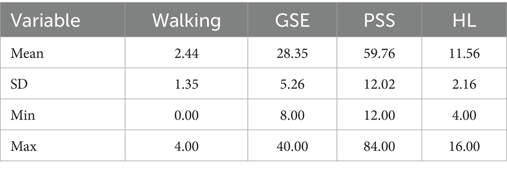 Table 1 presents the fundamental demographic characteristics of the participants. The sample comprised 1,550 individuals with chronic diseases, of whom 77.29% (n = 1,198) were over 46 years old. Additionally, 72.00% (n = 1,116) reported a monthly per capita household income below 6,000 yuan, and 45.61% (n = 707) attained an education level of junior high school or lower. Table 2 summarizes the walking and related variables. The mean walking score was 2.44 ± 1.35 (range: 0–4), the mean HL score was 11.56 ± 2.16 (range: 4–16), the average GSE score was 28.35 ± 5.26 (range: 8–40), and the mean PSS score was 59.76 ± 12.02 (range: 12–84).