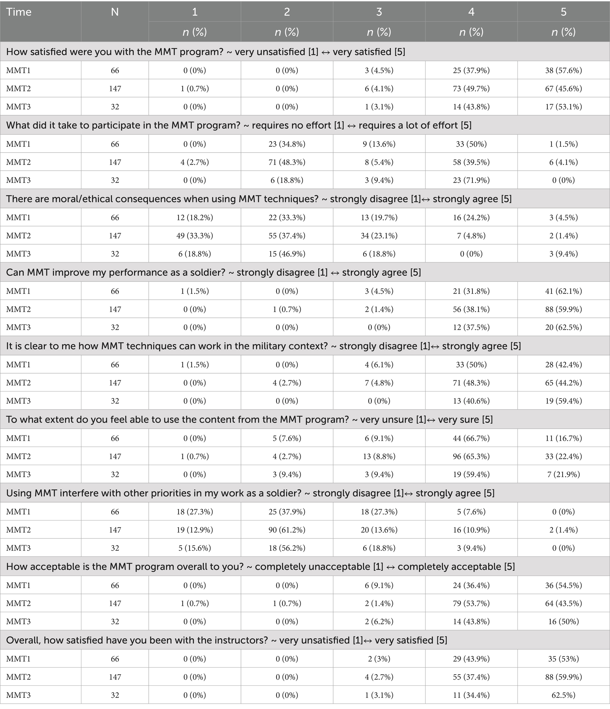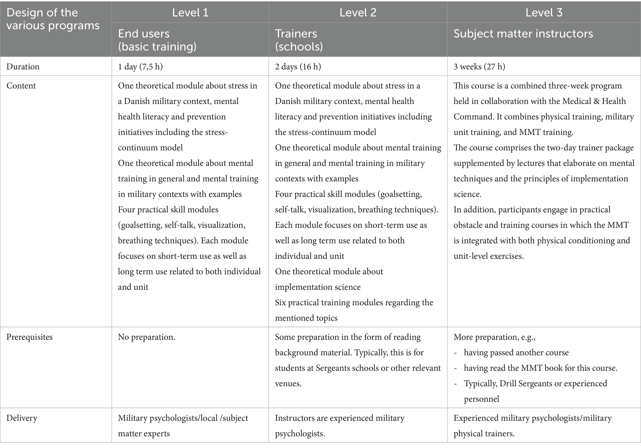 The MMT program was developed using an IM approach with inspiration from previous work conducted in specialized military and security units by (31–33). Unlike these earlier efforts, the present program targets a broader segment of the armed forces, necessitating tailored design and delivery considerations. Challenges related to delivery and cultural fit emerged most clearly during Step 5 (implementation planning). Specifically, stakeholder coordination and logistical constraints highlighted the importance of allocating sufficient planning resources early in the process. In this project, delivery within a military culture required balancing top-down expectations with the practical realities of military operations and training rhythms. Negotiating the appropriate training length served as a practical example of Step 3, where theoretical design needed to align with contextual feasibility. This required compromise between logistical realities and professional judgment on the factors necessary to support meaningful behavior change. As shown in the Step 4 pilot results (Table 2), >90% of participants across levels rated the program acceptable and of practical relevance in their military context. Also, >90% thought the program could improve their performance as a soldier. However, a key focus point from the verbal feedback was to ensure that the program would not function as a “stand-alone” intervention. Instead, it should be intentionally structured for integration within existing curricula and training structures, supporting sustainability and institutional alignment. Both central goals of IM Step 5.