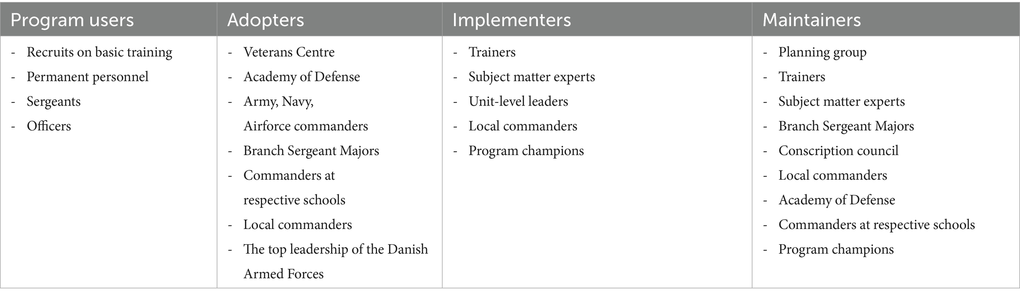 As part of the implementation planning, adoption, defined as the formal decision by leadership or units to use the MMT program, was identified as a key implementation outcome as well as a vital performance objective (59). From the outset, full-scale adoption was considered contingent on institutional integration of the program into official learning plans and training descriptions. These documents define the core parameters for program delivery, including intended learning outcomes, instructional methods, duration, required materials, and logistical considerations. Accordingly, efforts were directed toward embedding MMT content into existing military educational structures to ensure sustained and consistent use across units. In addition to this system-level objective, the planning group outlined specific performance objectives tailored to relevant key stakeholders, including decision-makers, implementers, and end users. These objectives are summarized in Table 4 and were used to guide targeted implementation strategies.