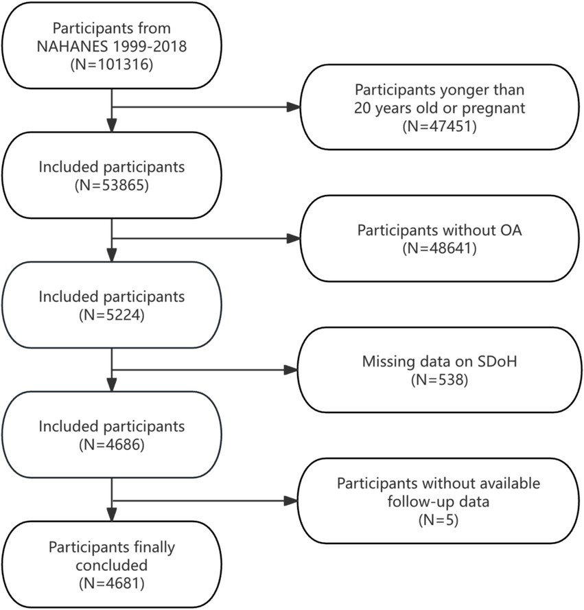 This analysis aggregated data across 10 NHANES survey waves (1999–2000 to 2017–2018), initially including 101,316 individuals. To ensure sample comprehensiveness and relevance, we established specific inclusion and exclusion criteria. Exclusion criteria were as follows: (1) Participants younger than 20 years or pregnant (n = 47,451), (2) individuals not meeting OA diagnostic criteria (n = 48,641), (3) incomplete SDoH data (n = 538), and (4) lacking complete follow-up information (n = 5). After exclusions, the final analytical cohort comprised 4,681 eligible participants. Figure 1 details the selection process.