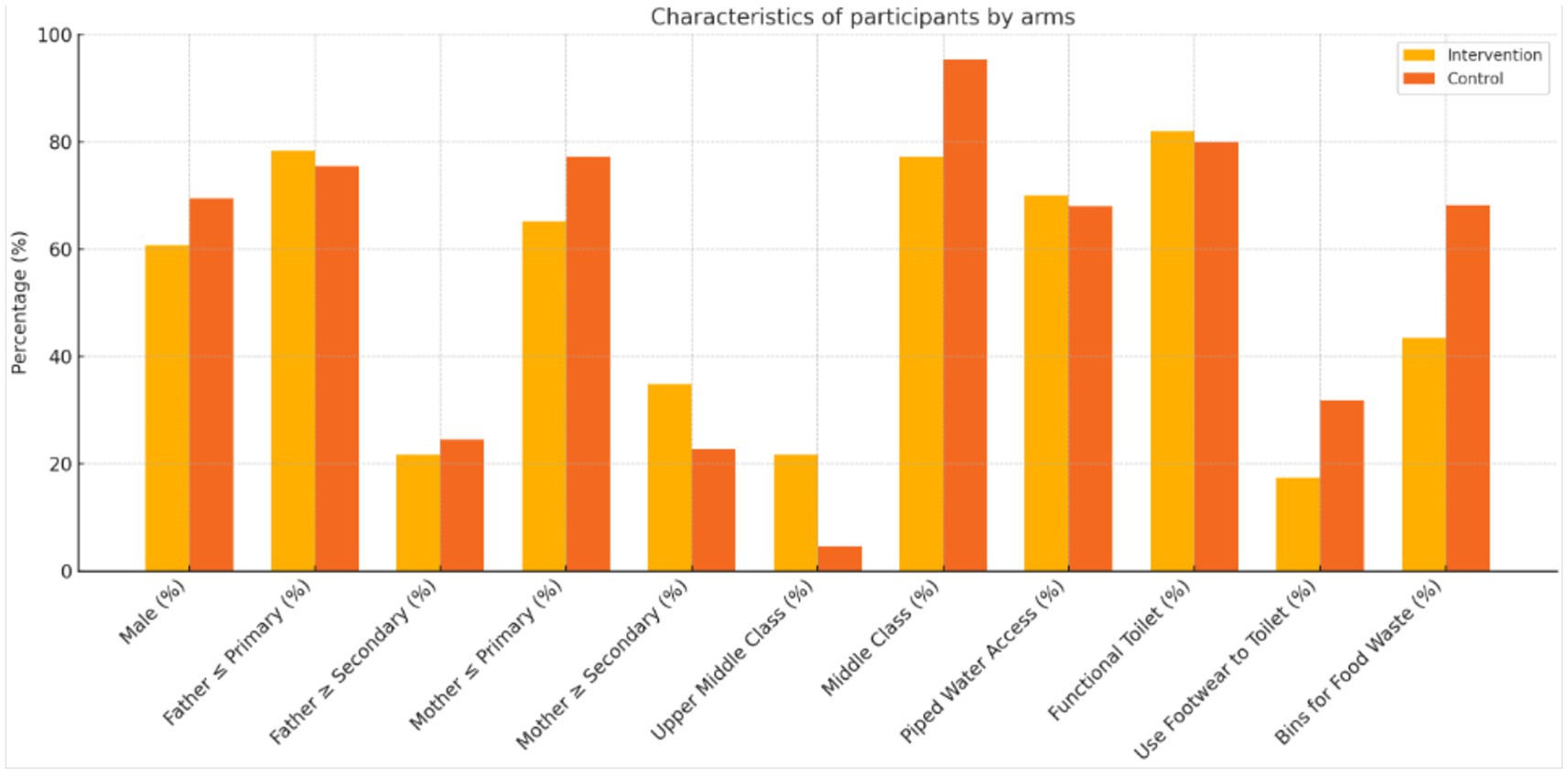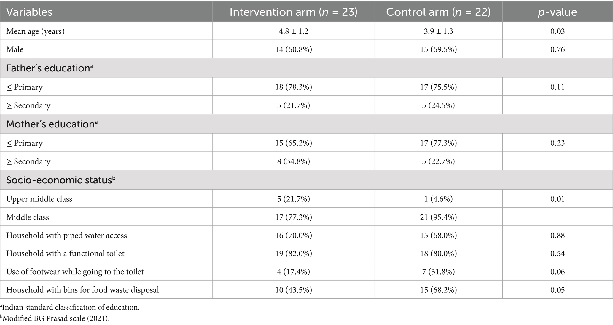 Table 1 depicts the characteristics of study participants in the intervention and control arms. The mean age of participants in the intervention group was found to be higher (4.8 ± 1.2 years) compared to the control group (3.9 ± 1.3 years). The proportion of male participants in the two groups (60.8% vs. 69.5%) and parental education were similar, with a majority having completed primary education. Upon analysing the socioeconomic status, 21.7% of participants belonged to the upper middle class in the intervention arm compared to 4.6% in the control arm, which is statistically significant (p = 0.01). Access to WaSH-associated household infrastructure was also uniformly distributed across the two arms. However, in the control arm, a slightly higher proportion of participants reported using footwear while going to the toilet (31.8% vs. 17.4%) and having bins for food waste disposal at their home(68.2% vs. 43.5%).
