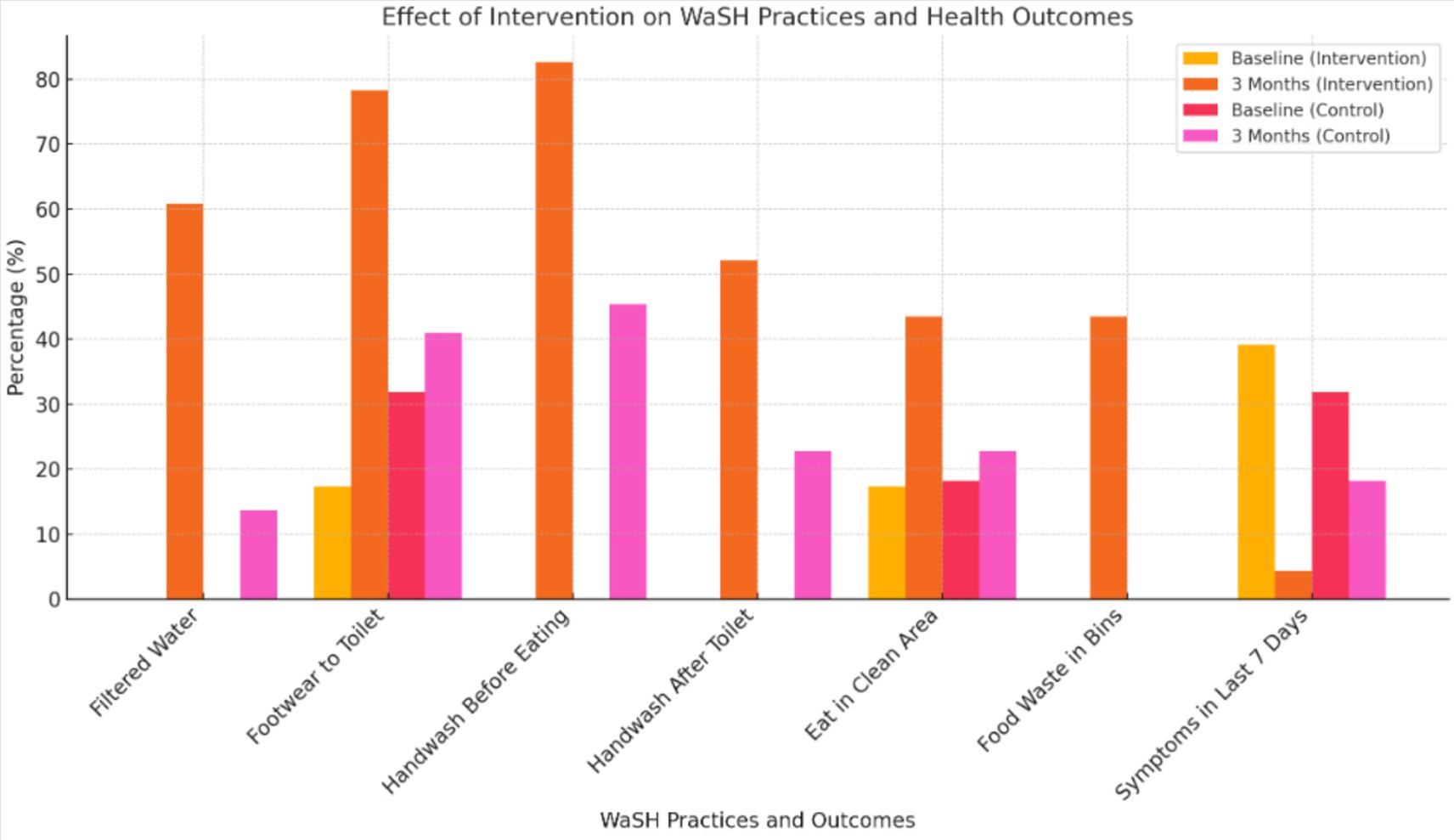 • Toilet Sanitation (Footwear Use): Rose to 78.3% versus 40.9% in control (AOR = 5.18; p < 0.01).