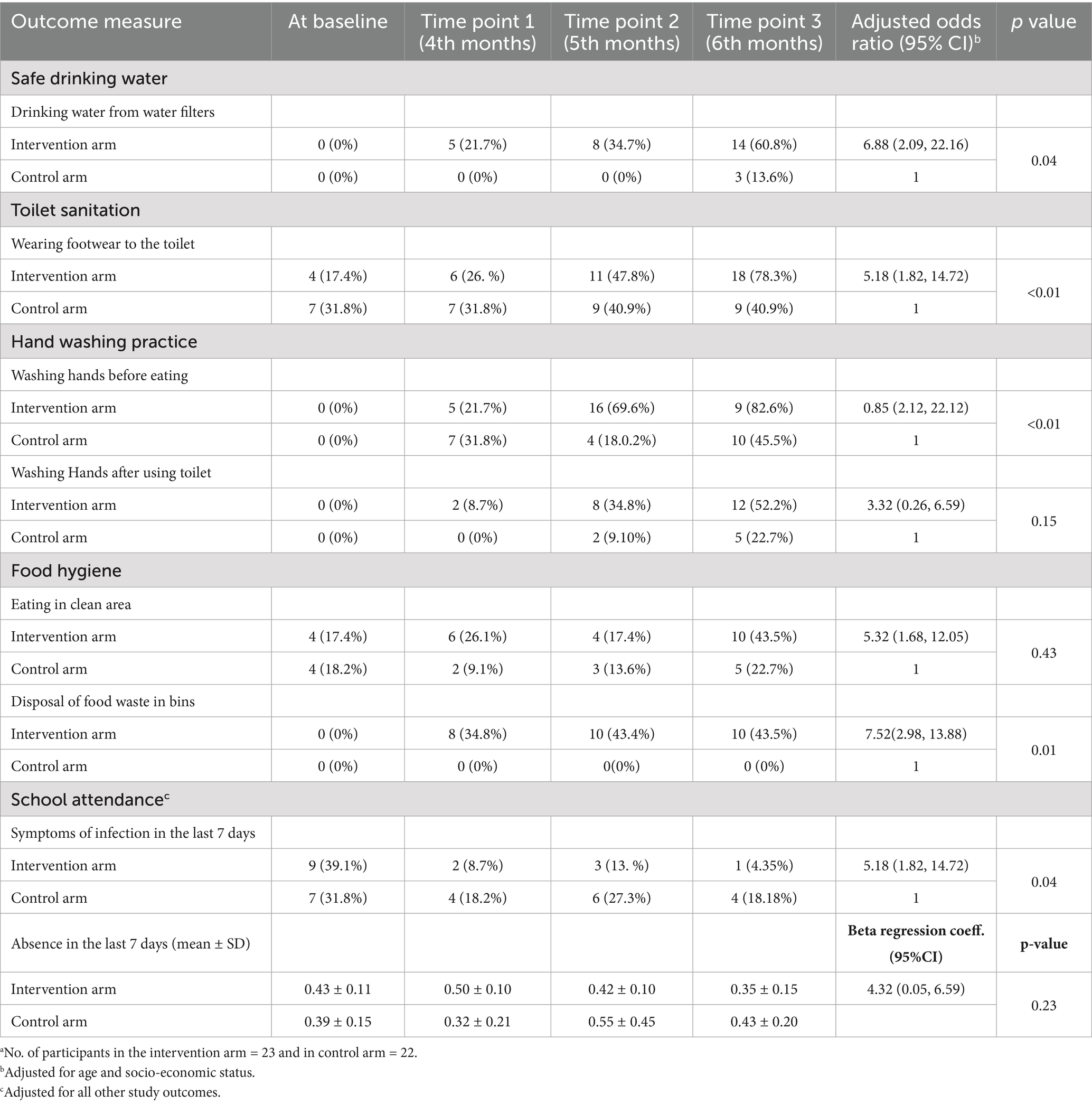 Tables 2, 3 are dynamic and capture data across three observation points (1 month apart) post-intervention in the intervention group. They demonstrate the magnitude of intervention effects compared to controls, adjusting for baseline differences where applicable. Age of the participant was a priori while building the regression model. Table 1 suggests that those in the intervention group were relatively more affluent than those in the control group in terms of the Socio-economic status (SES) of the participants, which might have an impact on hygiene practices and access to infrastructure. Thus, the socioeconomic status of participants was considered a potential confounder in the analysis of the intervention effect.