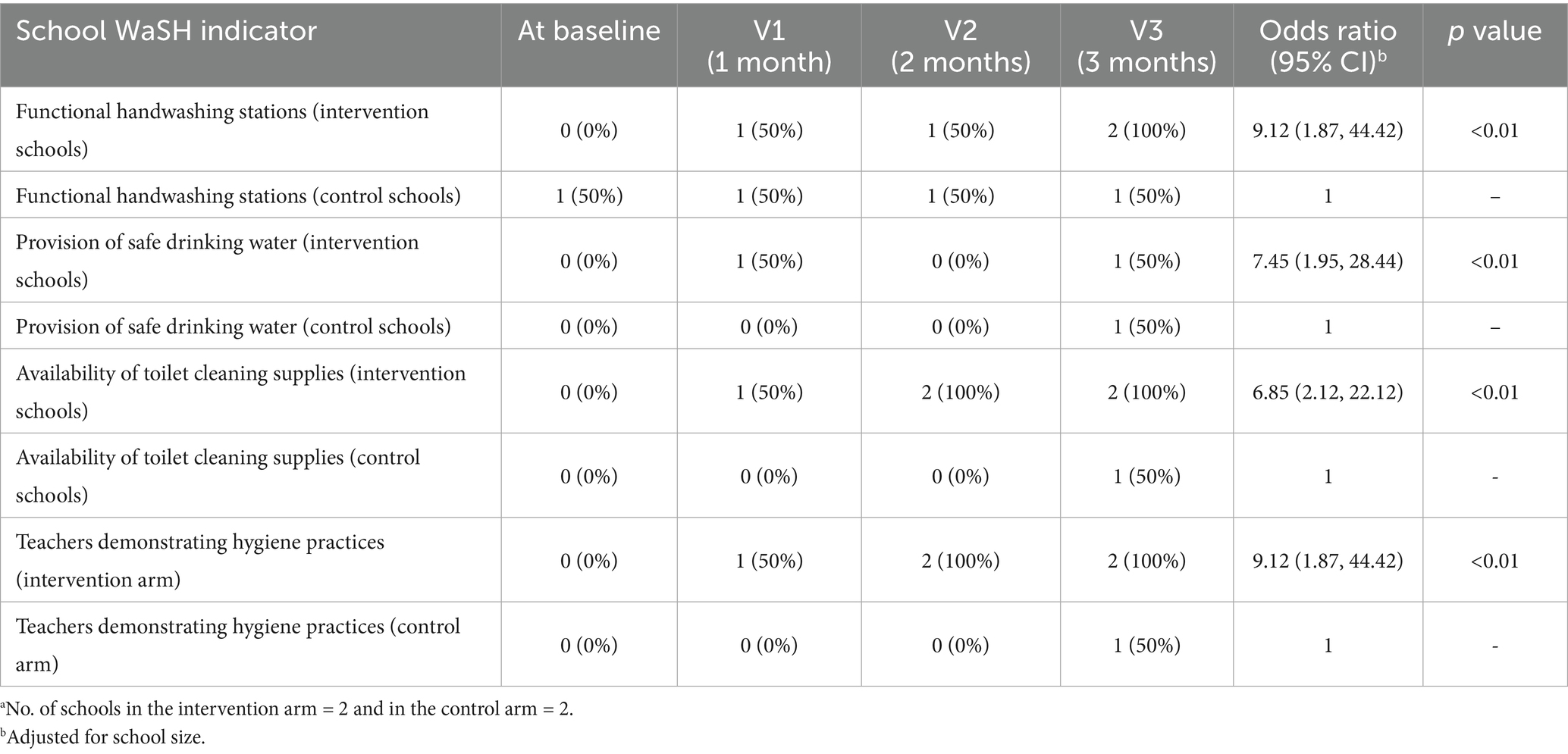 • Functional handwashing stations, toilet cleaning supplies, and hygiene demonstrations increased significantly in intervention schools (all p < 0.01).