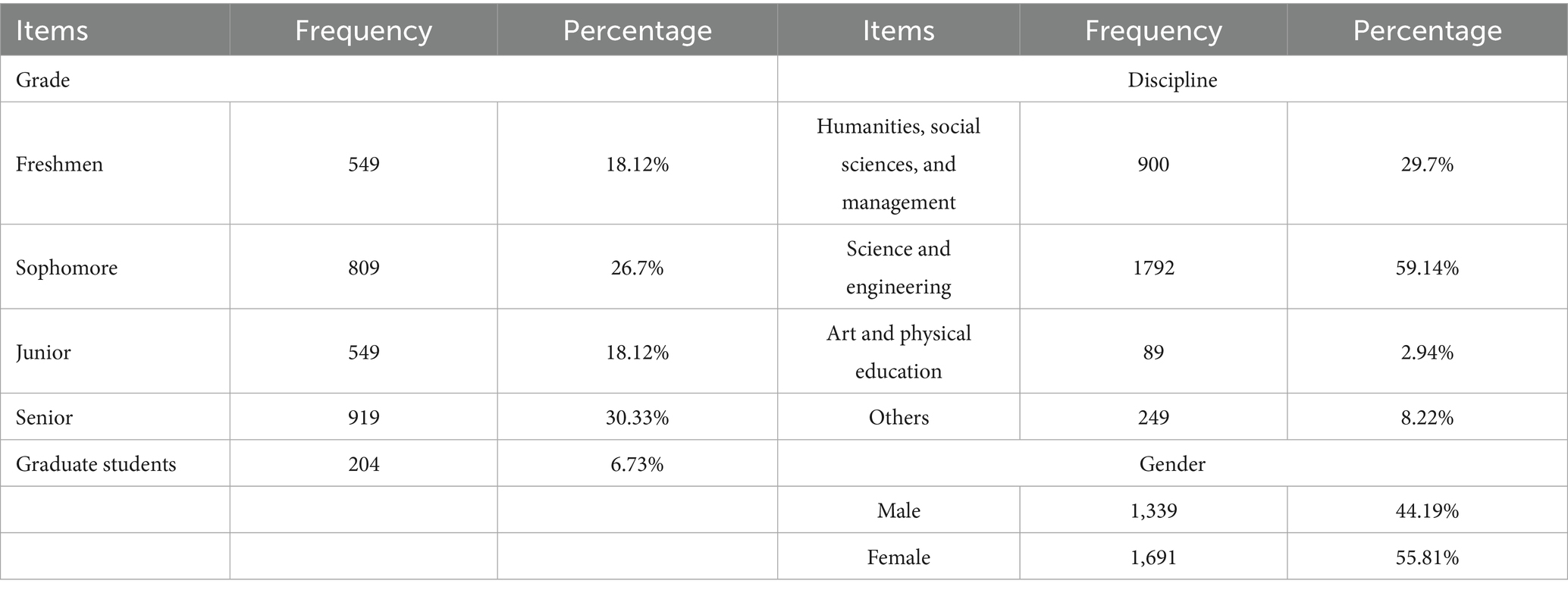 The data collection phase began in June, and questionnaire data filled out by college students was collected by August 31. Taking advantage of college students’ sufficient time and high willingness to participate during the summer vacation, this study conducted questionnaire data collection among Chinese college students through multiple channels. To enhance their enthusiasm for participation, the structure of questionnaire was designed to be concise and easy to understand, with simple operational steps required for completion. Additionally, cash incentives were provided to respondents who completed valid questionnaires, and all target participants included in the study finished the questionnaire. A total of 3,651 questionnaires were collected; however, those with a response time of less than 50 s and those with obviously inconsistent responses were excluded, with 3,030 valid questionnaires finally retained. After verification, the demographic characteristics of the sample in this study showed good consistency with those of the overall population of college students nationwide. According to the relevant formula, with a common 5% sampling error and a 95% confidence level, the minimum required sample size is 385 valid questionnaires (52), and the sample size of this study meets the standard. As shown in Table 2, among the valid samples, 55.81% were female. From a grade distribution perspective, freshmen accounted for 18.12%, sophomores for 26.7%, juniors for 18.12%, and seniors for 30.33%. The proportion of undergraduate students across all grades was relatively balanced, while that of graduate students was lower. However, overall, the sample data spanned a wide range of academic disciplines, providing some representativeness in subsequent analyses. In terms of discipline categories, engineering and technical fields made up 59.14%. This was followed by humanities, social sciences and management, which accounted for 29.7%. Art and physical education made up a small proportion at only 2.94%. The study’s sample covered all academic disciplines and was broad, this diversity makes subsequent analytical studies both valuable and meaningful.