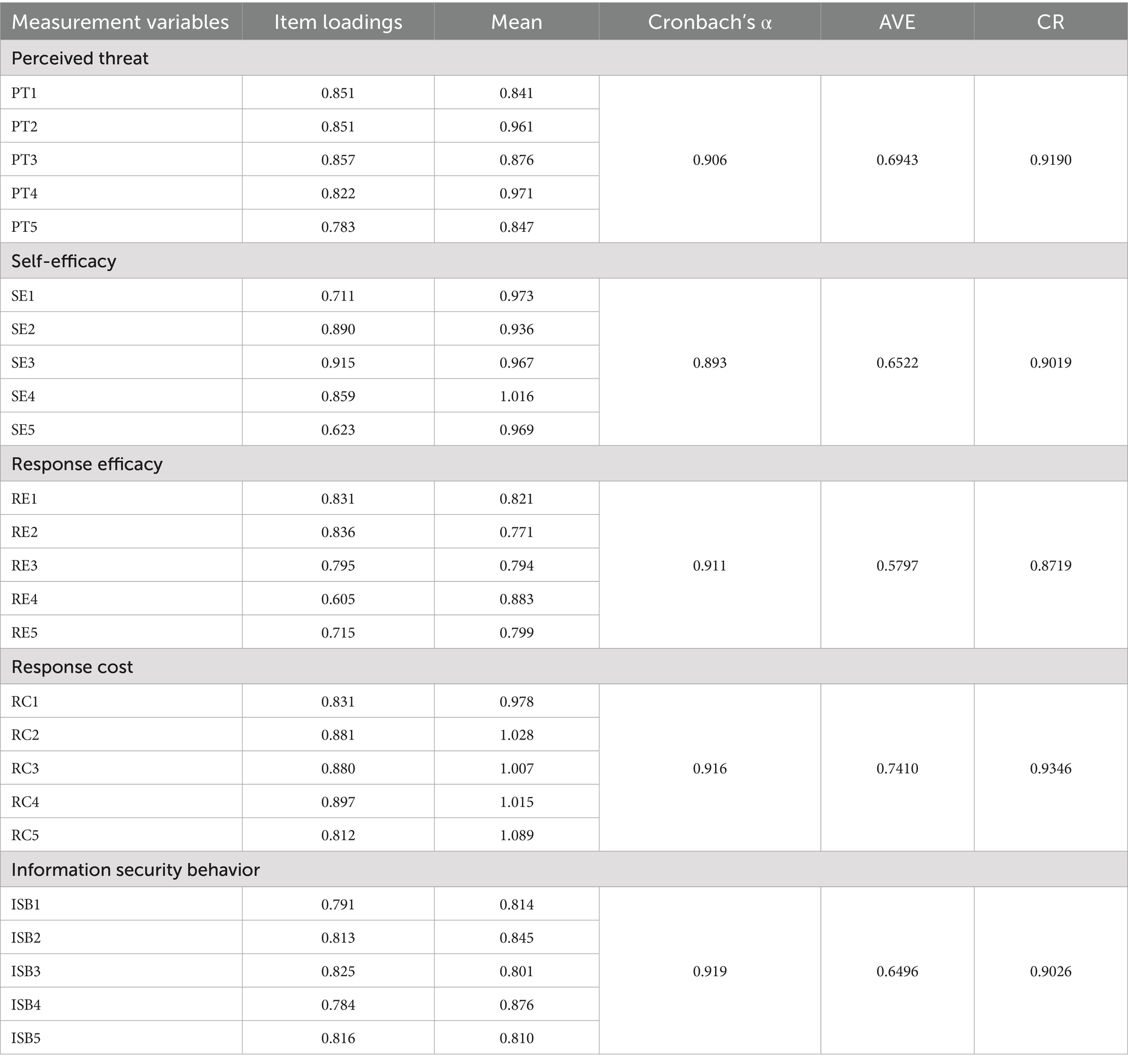 This study first conducts a comprehensive review of relevant literature to synthesize existing research on information security behavior. Building on PMT, we compiled related research variables and measurement items, integrated the hypotheses proposed in this study, and designed a questionnaire to investigate factors influencing college students’ information security behavior. The questionnaire includes five variables: perceived threat (PT) (41), self-efficacy (SE) (43), response efficacy (RE) (44), response cost (RC) (45), and information security behavior (ISB) (46), each measured by five items. It also contained four items capturing respondents’ demographic information. To further explore the barriers to college students’ information security behavior, an open-ended question was included, asking students to identify reasons they refrain from adopting information protection measures, such as setting strong passwords, installing antivirus software, and handling information carefully in their daily Internet use. All measurement items are derived from existing domestic and international literature, and the scale was adjusted according to the characteristics of college students’ information security behavior, resulting in the final research questionnaire. The questionnaire adopts a 5-point Likert scale for measuring variables, facilitating both data collection and subsequent analysis. Response options ranged from “1″ for “strongly disagree” and “5″ for “strongly agree.” Respondents answer the questionnaire based on their actual situations and with reference to their daily experiences. A preliminary study involving 230 participants from the target college student population was conducted to refine the questionnaire and ensure its clarity and relevance. For preliminary scale validation, the recommended sample size is three to five times the maximum number of items in any subscale. A larger sample size typically improves scale testing outcomes. While a minimum sample size of 15 is sufficient for preliminary assessments, the sample size for this study exceeded this threshold, meeting scientific research standards (47). Specific details regarding measurement indicators, their source literature, and item descriptions are presented in Table 1 below.