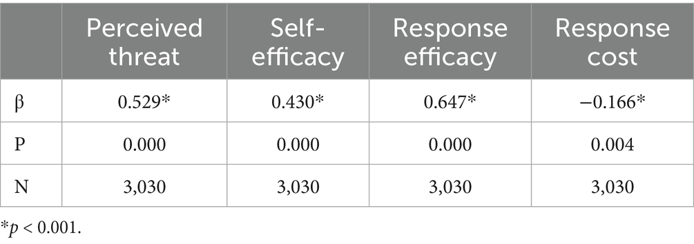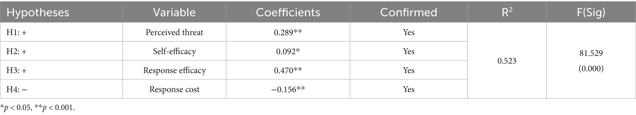 The hypotheses predicted that perceived threat (H1), self-efficacy (H2), response efficacy (H3), response cost (H4) would significantly predict security intentions. Regression analysis using SPSS 20 revealed the following significant effects on college students’ information security behavior (Table 5). Response efficacy had a significant positive impact (β = 0.470, p<0.001); perceived threat also exerted a significant positive effect (β = 0.289, p<0.001); response cost showed a significant negative influence (β = −0.156, p<0.001); and self-efficacy exhibited a marginally significant positive association (β = 0.092, p<0.05). The results show that perceived threat, response efficacy, and self-efficacy all exert a significant positive impact on college students’ information security behavior. This indicates that the more acute college students’ perception of information security risks is, the greater their trust in the effectiveness of information security measures, and the more confident they are in their own implementation capabilities, the more likely they are to adopt information security behavior.