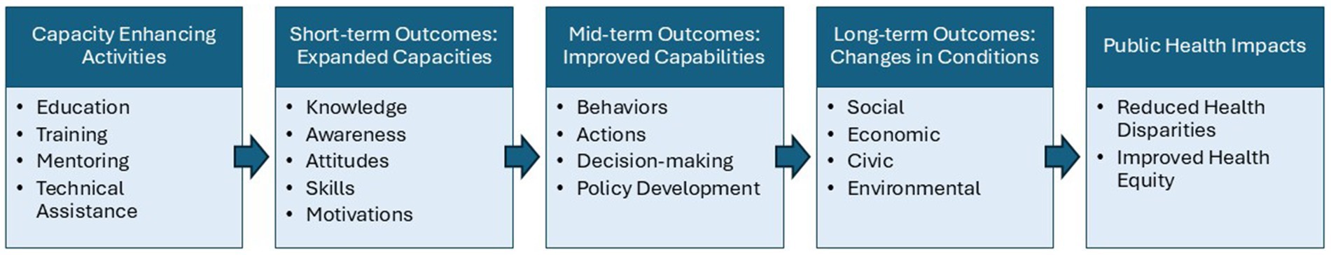 As in-depth outcomes evaluation is wanting related to public health workforce development efforts (e.g., in contrast to medical education), we invite scholar-practitioners to consider adoption and adaptation of this Theory of Change (Figure 2) to help guide medium and long-term evaluations of public health efforts. In this exploratory use case, we depended on an interview-based protocol and questions to elucidate and validate categories and themes, but as a next step, we anticipate alternative use cases that use these categories and themes to inform larger-scale survey-based evaluation that can more rapidly and thoroughly explore how knowledge and skills (capacities) are being applied in the workplace (capabilities) and for what purpose (changes in conditions), complemented by structured short-answer questions that still invite storytelling. Doing so will support evaluation framed around current public health frameworks (e.g., strategic skills) where skills or performance gaps are known and also help to describe the effects or impacts being seen as a result of expanded capacity. We posit that shared use of this emerging framework for grounded mixed methods evaluation will help develop a collective body of research that shows best practices, value, and impacts of public health capacity-building initiatives. This is especially important given the ubiquity of workforce challenges such as burn-out and erosion of trust. With a shared impact framework, all capacity-building evaluations can start aligning questions related to retention, leadership development, and improved trust.