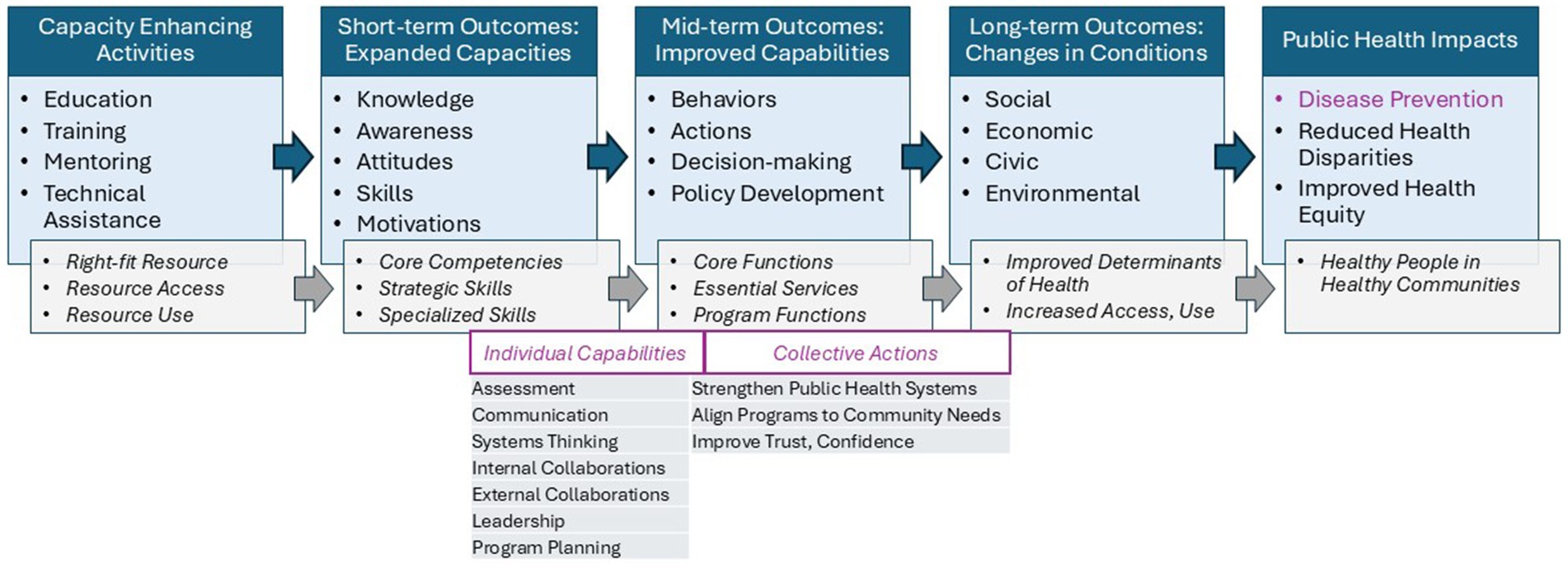 While numerous approaches are being used to build capacities among the public health workforce in the US and globally, there is a paucity of reports on if or how workforce training needs are being met, and if or how increased workforce capacity manifests in real-world settings (32). We posit that a focus on this is critical. At present, despite a concerted focus on workforce development, literature to help inform evaluation of outcomes is scant. For example, repeat rounds of PH WINS show no significant change closure of skills gaps despite the broad availability of capacity building resources (15). Further, while there is some literature reporting on the short-term effectiveness of trainings (e.g., knowledge or skill-gains pre-post training intervention) (14, 33, 34), a 2023 study on COVID-19 contact tracing scale-up stated that their work was the “first comprehensive analysis” that aimed to illustrate the interrelationships between the capacities, capabilities, outcomes, and impacts (35). This may be because impacts are not easy to identify—especially in the short-term—and are highly context-specific. Evaluation of longer-term outcomes or impacts appear more prevalent in health care fields, where the application of expanded capacities can be observed by a supervisor or an evaluator (36–38), but even an implementation study exploring workers’ expanded capacity to address HIV and TB identified public health impacts as an evaluation criterion that was hard to measure. The research team reported several challenges in monitoring and reporting on public health impacts, including building systems for monitoring impacts, securing resources, and engaging leadership (39).