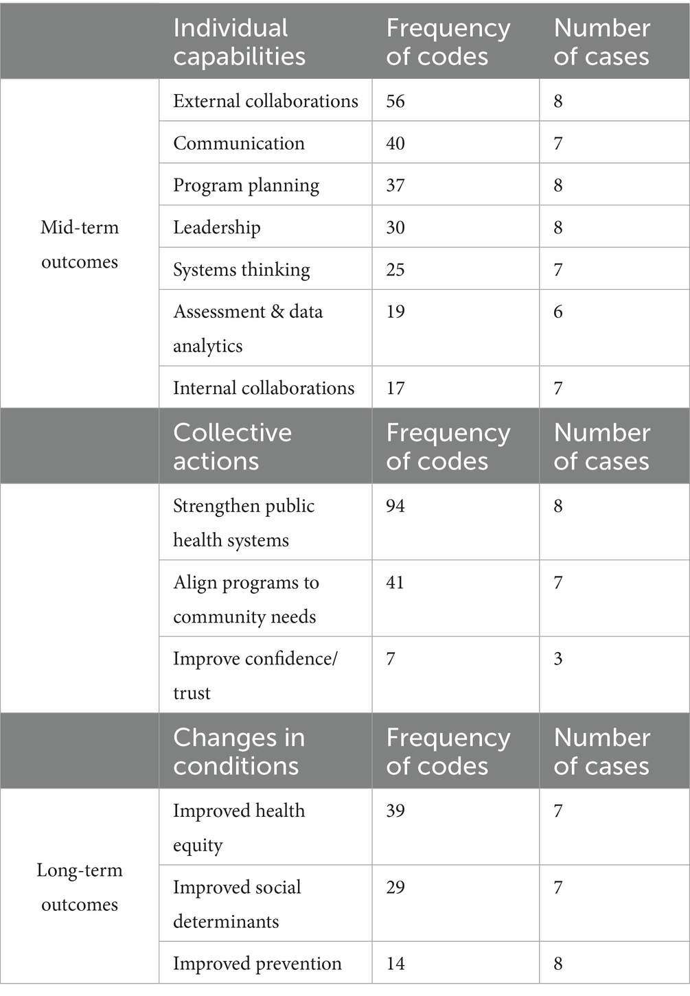 Qualitative analyses of the coded transcripts were conducted Spring-Fall 2024 (JL, CF). Code application frequencies were used to explore cross-case themes (Dedoose, Version 9.2.006) and to identify emergent capabilities being applied to modify conditions to improve community health.