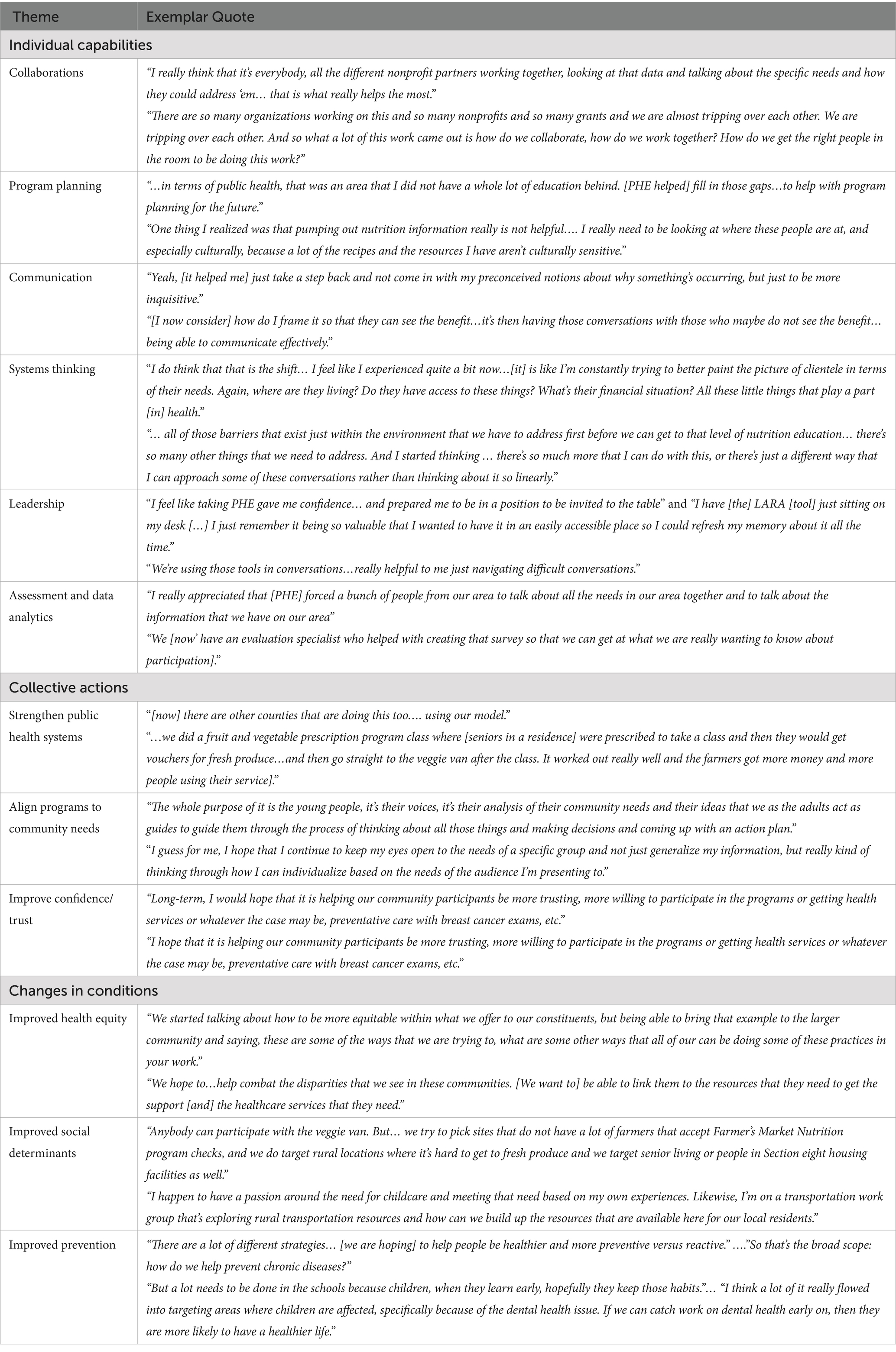 A priori, we hypothesized that the PHE graduates might be able to describe how their PHE-supported changes in knowledge and skill (short-term outcomes) have led to changes in their capabilities (mid-term outcomes), helping them work toward community impacts. Via the coding process, two distinct types of “improved capabilities” were noted: behaviors or actions taken by an individual (Individual Capabilities), and behaviors or actions taken by an organization (Collective Actions); respondents also described some outcomes (Changes in Conditions) they hoped to see as a result of their actions.