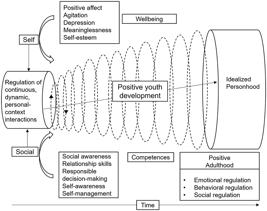 There is a close link between PWB and SEC, with several researchers showing that higher SEC contributes to effective reduction of depression symptoms and positive development of PWB (47–49). Adolescents who demonstrate positive PWB and high levels of SEC often exhibit a more pronounced positive trend in their personal growth and development, which enables them to achieve their idealized personhood. Ultimately, these positive characteristics could lead to positive adulthood, which encompass sound emotional, behavioral, and social regulation skills (50, 51). Therefore, PYD serves as the ultimate goal for enhancing students' psychological wellbeing and social emotional competence.