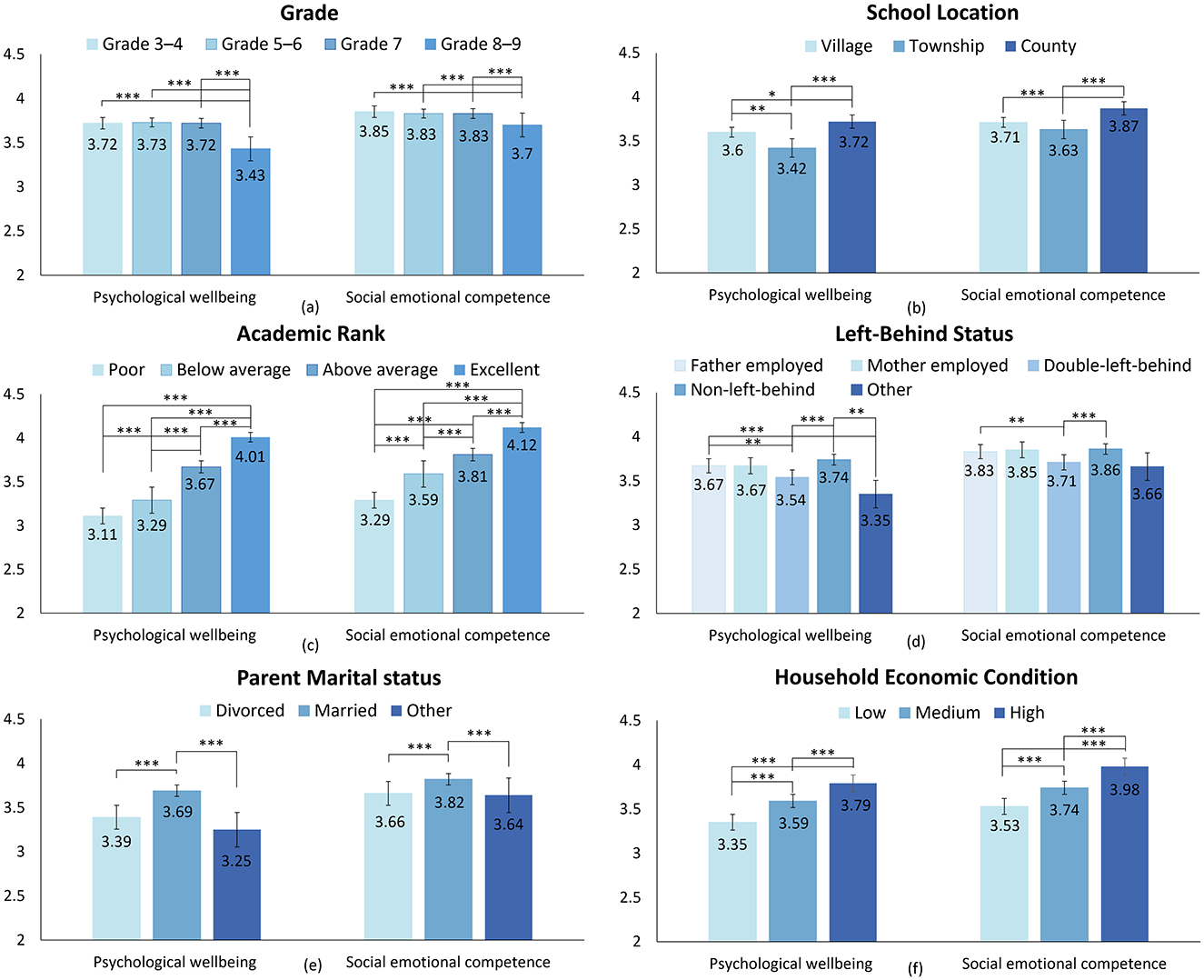 To further compare participants' PWB and SEC levels against their baseline characteristics, we plotted a series of bar charts to demonstrate the between-group variance; significant differences are marked with asterisk(s), as shown in Figure 2. The baseline characteristics can be classified into two categories: school-related characteristics including grade, school location, and self-reported academic rank; and family-related characteristics, including left-behind status, parent marital status, and household economic condition. Overall, the PWB and SEC scores demonstrate similar patterns across different baseline characteristics.