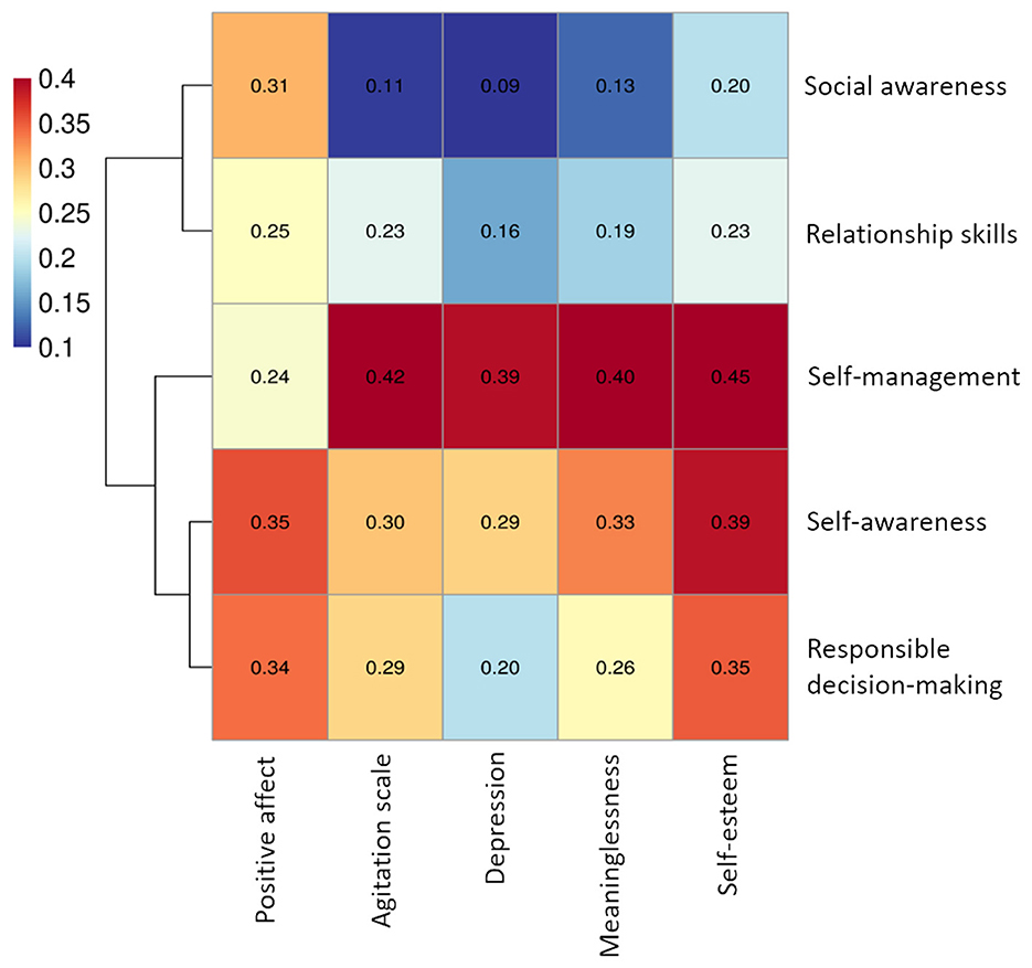 Correlation analysis was conducted to further examine the relationship among the key constructs of PWB and SEC. As shown in Figure 3, there is a moderately low correlation between various dimensions of PWB and SEC. Self-management shows the strongest correlation with participants' self-esteem (r = 0.45) and also exhibits a moderate correlation with meaninglessness, depression, and agitation. Conversely, the results indicate that participants' social awareness exhibits the weakest correlation with PWB, particularly with depression (r = 0.09).