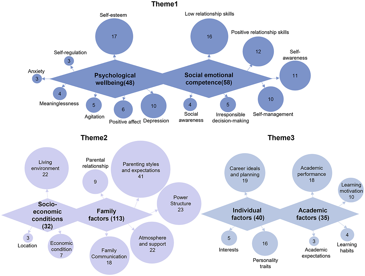 As shown in Figure 4, the six coded main themes—psychological wellbeing, social-emotional competence, socio-economic conditions, family factors, individual factors, and academic factors—were visually grouped into three color clusters, each corresponding to one theme finding (Theme 1–3). This visualization demonstrates how related domains were synthesized into broader interpretive narratives.