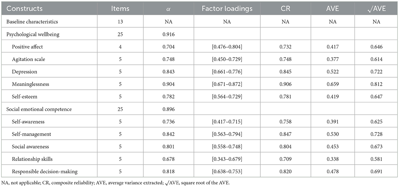 Preliminary analysis was conducted to evaluate the reliability and validity of the PWB and SEC scale, and the key results are presented in Table 1. The scale reliability was calculated using Cronbach's α in SPSS, with an α value greater than 0.7 indicating good internal reliability. The scale validity was determined by both convergent and discriminant validity (66). Acceptable convergent validity requires factor loading values greater than 0.4, composite reliability (CR) greater than 0.6, and average variance extracted (AVE) values greater than 0.5 (67). Discriminant validity requires that square root of the AVE (√AVE) is greater than the correlation coefficient between constructs (68). We conducted confirmatory factor analysis (CFA) in AMOS to calculate factor loadings. The coefficient of factor loading reflects the degree of association between variables and factors. As shown in Table 1, most statistical assumptions for Cronbach's α, factor loading values, CR, AVE, and √AVE are met, which suggests an overall good reliability and validity of the measurement.