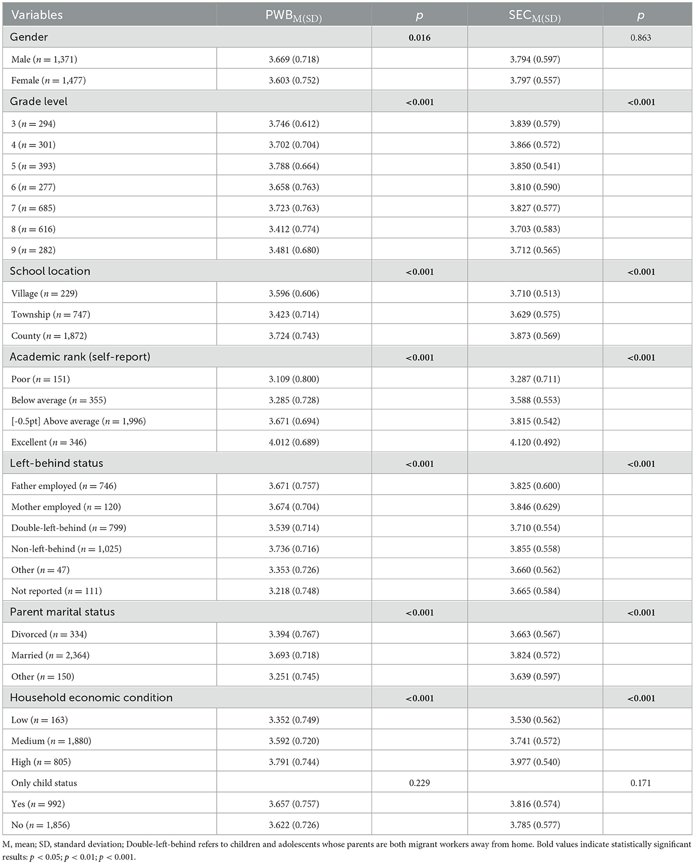The socio-economic variables (parent marital status, household economic condition, and left-behind status) were included to reflect the influence of family and socio-economic circumstances on adolescents' development. Parent marital status indicates family stability, with marital disruption often linked to greater risks of psychological distress. Household economic condition shapes access to economic and educational resources. The left-behind status, a phenomenon unique to China resulting from large-scale rural–urban labor migration, which has been associated in prior studies with psychological distress and difficulties in SEC. Overall, these variables provide a contextual foundation for examining the determinants of adolescents' PWB and SEC.