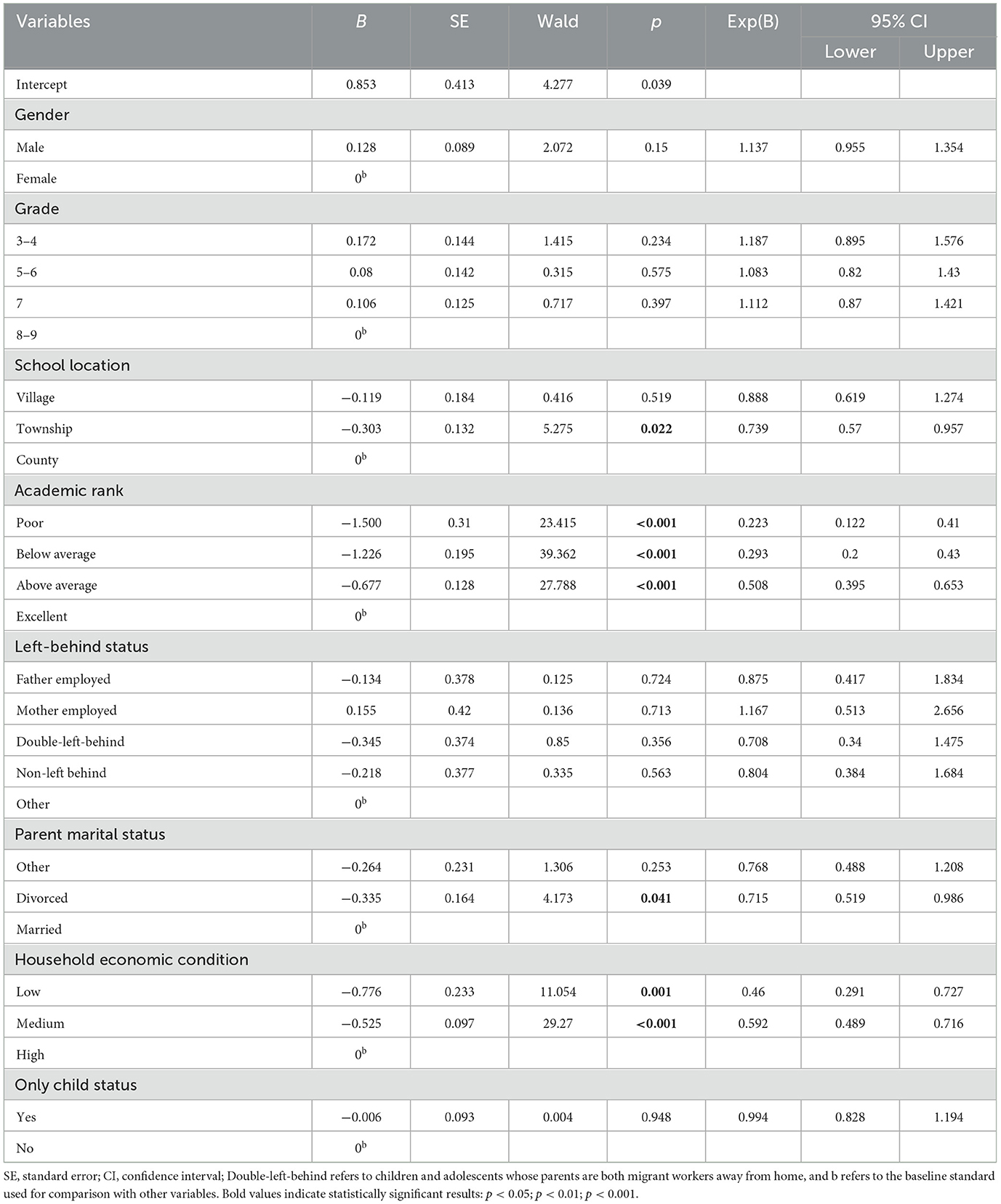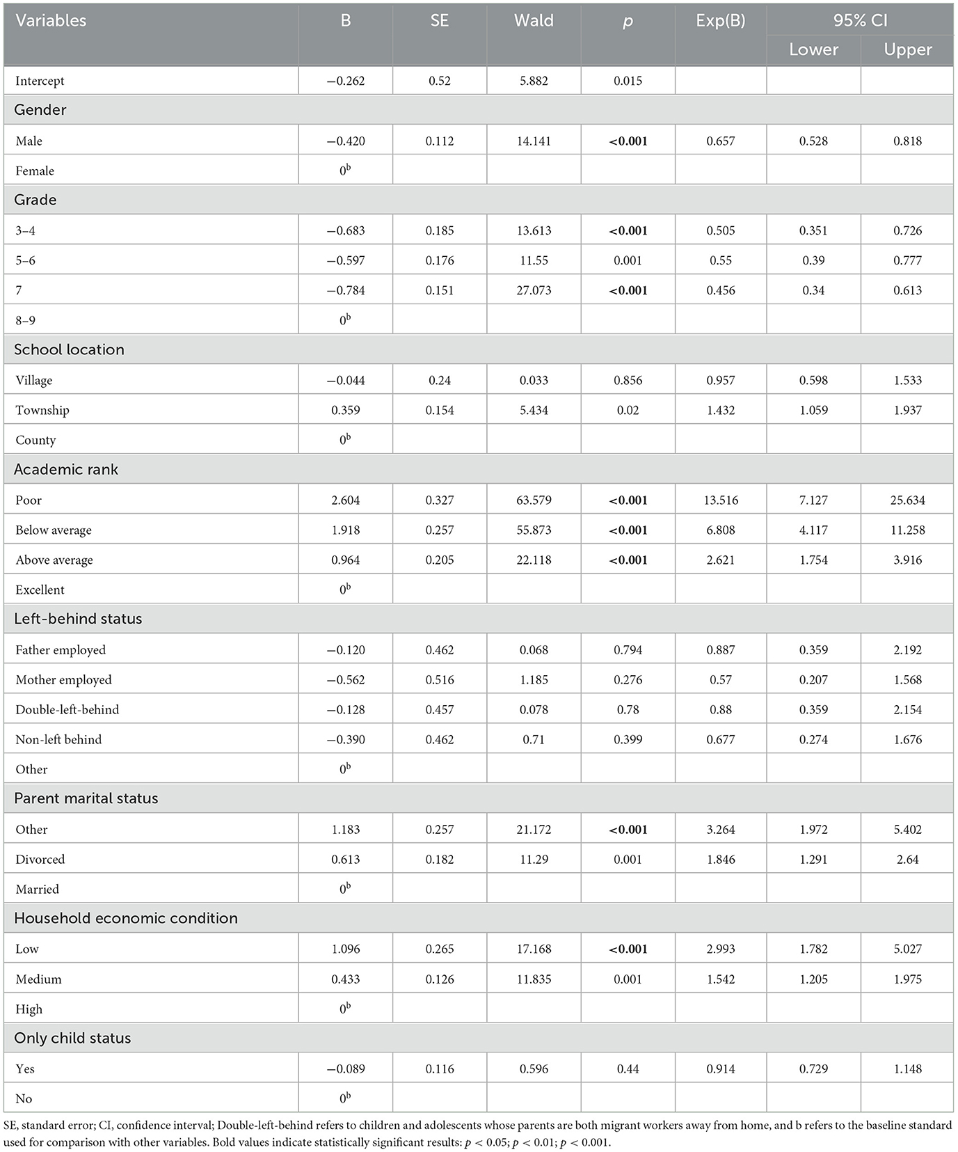 Socio-economic factors are also important. Research has shown that family cohesion and stable parental relationships serve as protective factors for adolescents' psychological adjustment, whereas parental marital conflict has been shown to predict adolescents' behavioral and psychological problems (60, 61). In addition, household economic conditions shape adolescents' access to essential living and educational resources, with economic hardship increasing the risk of mental health problems and limiting opportunities for social emotional development (62). Left-behind status increases vulnerability to emotional and behavioral problems, as the prolonged absence of parents often leads to disruptions in attachment, reduced emotional support, and fewer opportunities for socialization and guidance (63).