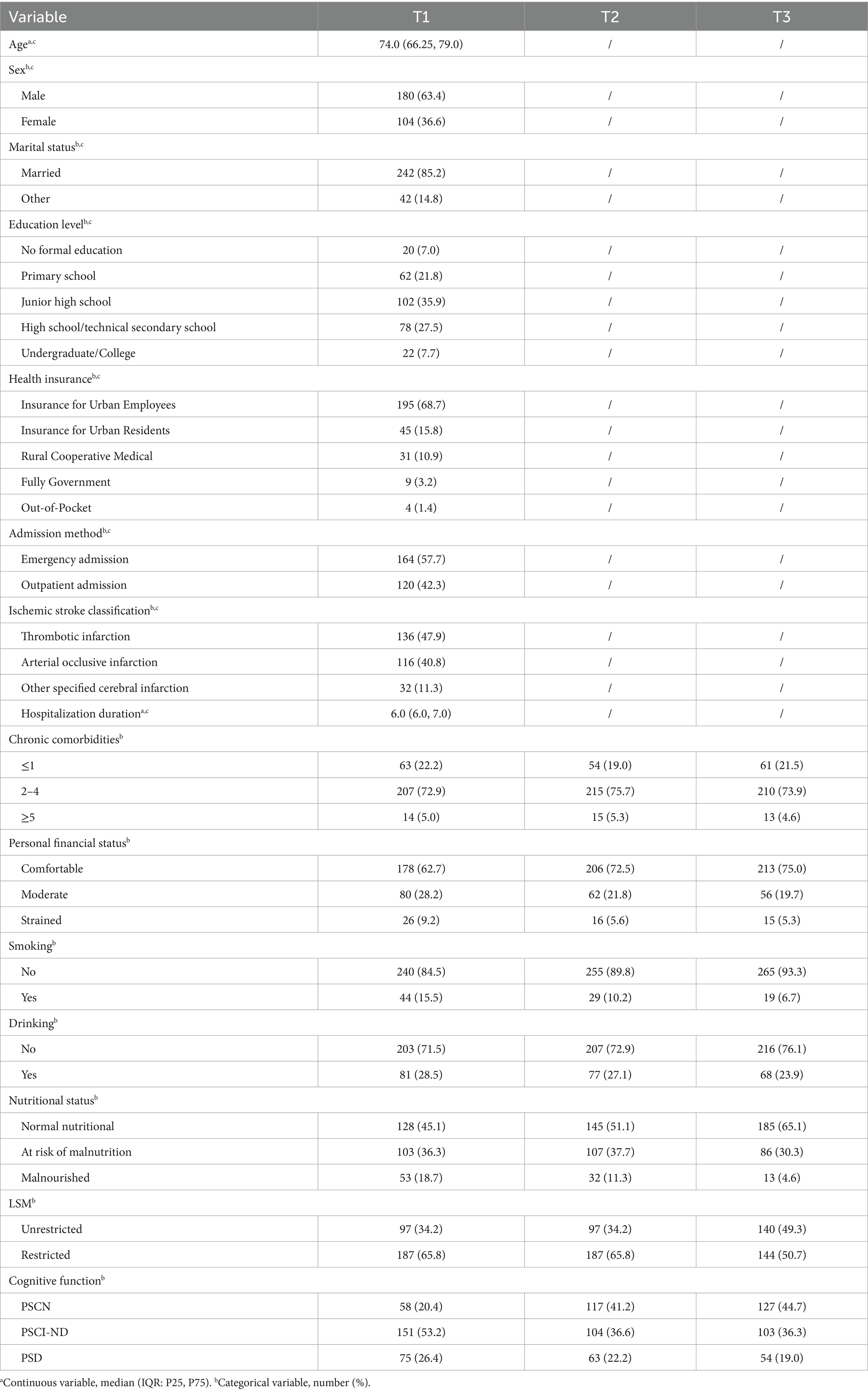 The appropriate sample size was determined based on Kendall’s principle, which recommends 10 to 20 observations per variable. This study had 15 independent variables involving patients. Accordingly, the minimum required sample size ranged from 150 to 300 participants. To account for an anticipated 20% attrition rate across the three longitudinal follow-ups, the initial target sample size was inflated to a minimum of 188 to 375 participants. A total of 284 participants were included in the study (after excluding 8 dislodged at T1, 12 dislodged at T2, and 6 dislodged at T3). To account for potential selection bias due to missing follow-ups, we repeated the analyses to include only the participants who had complete data on nutritional status, LSM, and cognitive function at all three follow-ups for longitudinal analyses. A final sample of 284 participants who completed all three assessments was therefore deemed fully adequate for the planned analyses. The inclusion criteria were: (i) Meeting the 《Diagnostic criteria for ischaemic stroke in the Chinese Guidelines for the Diagnosis and Treatment of Acute Ischaemic Stroke (2018)》 and is confirmed by cranial MRI and/or CT examination; (ii) ≥ 60 years; (iii) National Institutes of Health Stroke Scale (NIHSS) score<5. The exclusion criteria were as follows: (i) with significant visual or/and hearing impairment, unable to communicate effectively and complete questionnaires; (ii) with previous history of psychiatric illness; (iii) taking central nervous system drugs (e.g., diazepam, antidepressants, etc.); and (iv) with worsening or new lesions of unstable condition.
