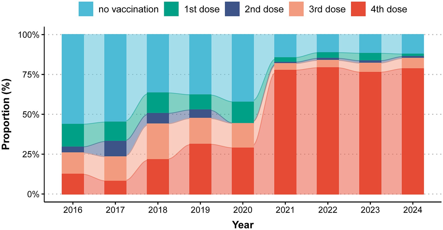 Vaccination is the most effective preventive measure for pertussis. Before 2025, China’s immunization strategy included four doses of diphtheria, tetanus, and acellular pertussis (DTaP) vaccine at 3, 4, 5, and 18 months. Despite high vaccination coverage, epidemiological data have revealed rising disease burden among school-aged children, who usually had completed this primary series (2, 9). In response, China implemented a revised immunization strategy in 2025, adding a booster DTaP dose at age six, aiming to protect school-aged children (10). However, previous seroepidemiological study indicating the pertussis-specific antibody induced by four dose DTaP wane before 6 years old (11–13). Should the booster vaccination be administered younger than 6 years old, just like other countries have done? (14–16) The distribution of vaccination history among pertussis cases is important to answer this question. However, this evidence was limited in China (17). Furthermore, under the previous national vaccination strategy, detailed epidemiological data on fully vaccinated cases (those infected after completing the 4-dose series) remain scarce.