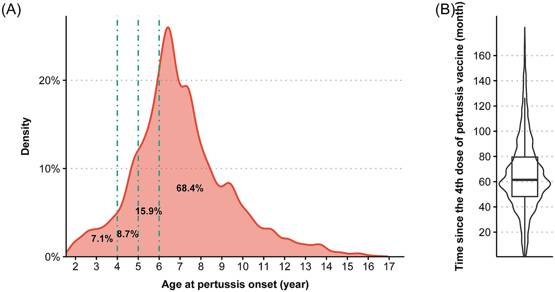 Figure 2. The distribution of (A) age at pertussis onset and (B) time between pertussis onset and the fourth dose of pertussis vaccine among pertussis cases finishing four dose vaccination (n = 43,004). *Percentages in the probability density plot denote the proportion of cases falling between adjacent age cutoff lines.