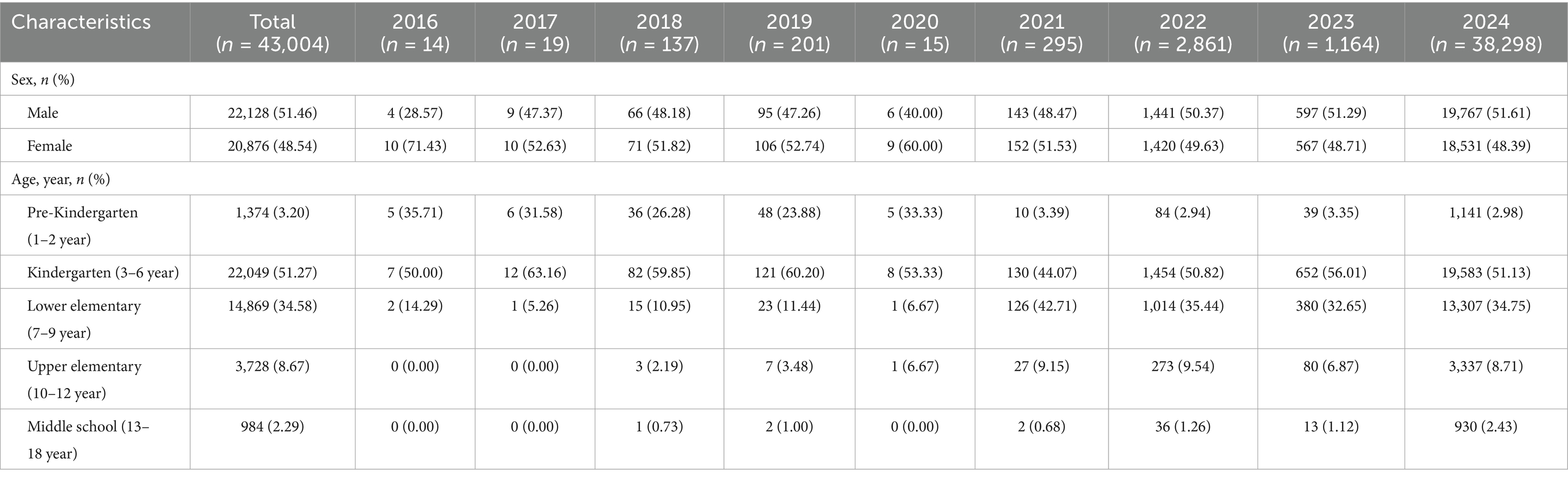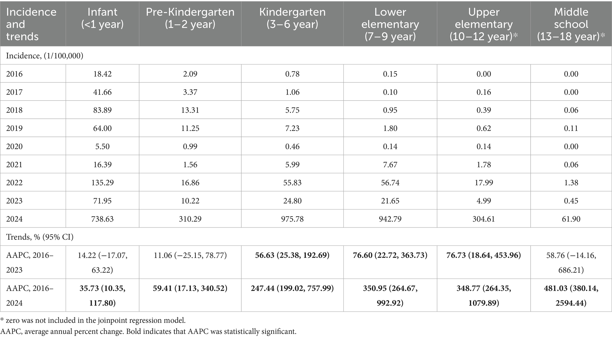 Annual and age-specific incidence rates (per 100,000 person-years) were calculated using case counts and corresponding demographic data. For trend analysis, a joinpoint regression model was used (20, 21), which managed to fit a series of joined line segments to the trends of incidence rates. A logarithmic transformation of the rates and the default parameters were selected as model options. The average annual percent change (AAPC) and its corresponding 95 95% confidence intervals (95% CI) were calculated to estimate the direction and magnitude of trends. Due to a substantial increase observed in 2024, AAPC was calculated separately for 2016–2023 and 2016–2024.