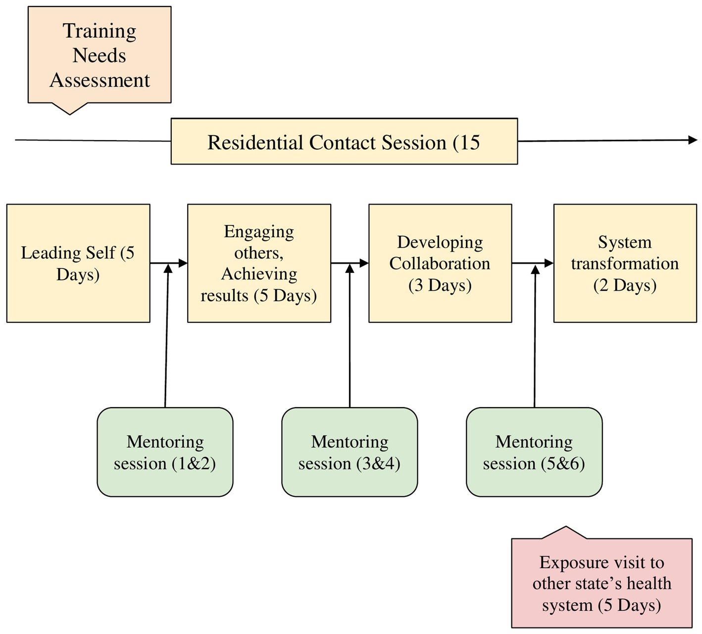 There is a striking mismatch between the rising global demand for competent healthcare workers and the minimal investment in their training—just 2% of total health expenditures (1). In the context of LMICs most public health and healthcare leaders come from clinical and medical backgrounds and have little or no formal management training to exercise leadership roles (2, 3). Despite several years of experience, clinical training alone does not prepare medical professionals for management/leadership responsibilities (4, 5). New leaders find the responsibilities of effectively managing scarce resources, staff, funds, drugs, equipment, infrastructure, and collaborating with other sectors, challenging (6). There is a critical need for systematically enhancing leadership capacity to ensure effective delivery of public health and healthcare services. Formal leadership training within the public health sector is not institutionalized, leaving health professionals unprepared when transitioning into senior positions within state health departments (7, 8). Limited studies in health care organizations (9, 54) focus on capacity-building programs for the government’s public health and healthcare employees.