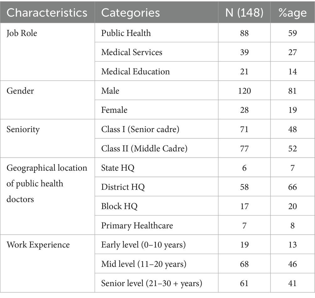 A total of 150 officers attended the program between August 2022 and March 2025. divided as three cycles. Each cycle consisted of two batches of 25 officers, totaling six batches. To select participants, the Government invited nominations from all 33 districts in Gujarat. Participants were selected based on predefined criteria: a minimum of 15 years of experience, not more than 50 years of age, and a proven track record of efficient work in public health, medical services, or medical education at the state or district levels. Two of the officers dropped out of the program due to personal reasons, resulting in 148 officers. Table 1 indicates the profile of the participants who benefited from the program. After completing training for six batches, the program’s effectiveness was evaluated.