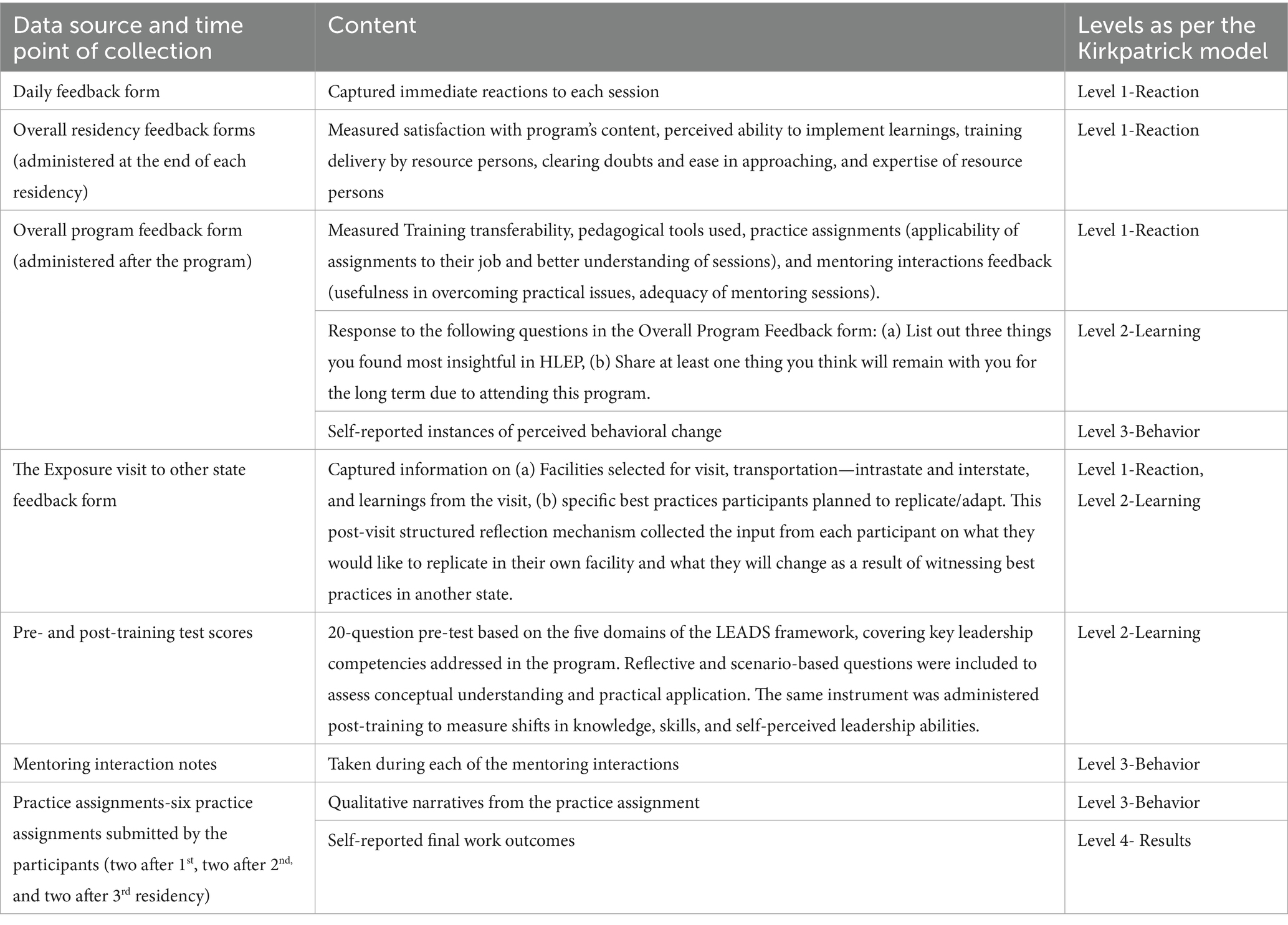 We selected the LEADS framework because of its conceptual breadth, methodological rigor, and adaptability to India’s public health context. Developed in Canada through the Leadership Competencies for Public Health Practice project, it was specifically designed for interdisciplinary public health practice, covering seven disciplines, including medicine, nursing, epidemiology, and health promotion (15, 19). Its structure includes 49 competencies across five domains: Leading Self, Engaging Others, Achieving Results, Developing Coalitions, and Systems Transformation. It offers a validated and internationally recognized foundation, a comprehensive yet straightforward model that addresses both individual and systems-level leadership functions, which facilitates adaptation in LMIC contexts (16). Moreover, the LEADS framework has been successfully applied in various contexts, demonstrating its utility in developing leadership skills to enhance organizational performance (55). The adapted model of the LEADS framework informed the design, delivery, and evaluation of the HLEP.