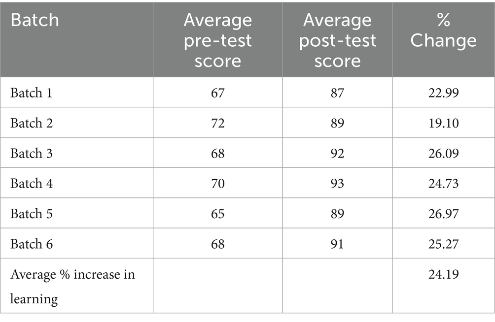We assessed learning improvement by comparing pre- and post-training test scores and overall program feedback. For Level three- Behavior, qualitative narratives from the practice assignment were analyzed to extract examples of changed behaviors in participants’ current job settings. Level four- Results were primarily captured through self-reported final outcomes at the workplaces from the practice assignments. Participants were expected to carry out an individual leadership-level collaborative intervention as part of the third practice assignment. Reports on the procedure and results of their work were requested. We organized these qualitative narratives to highlight the program’s overall impact and effectiveness at the individual, team, and organizational levels.