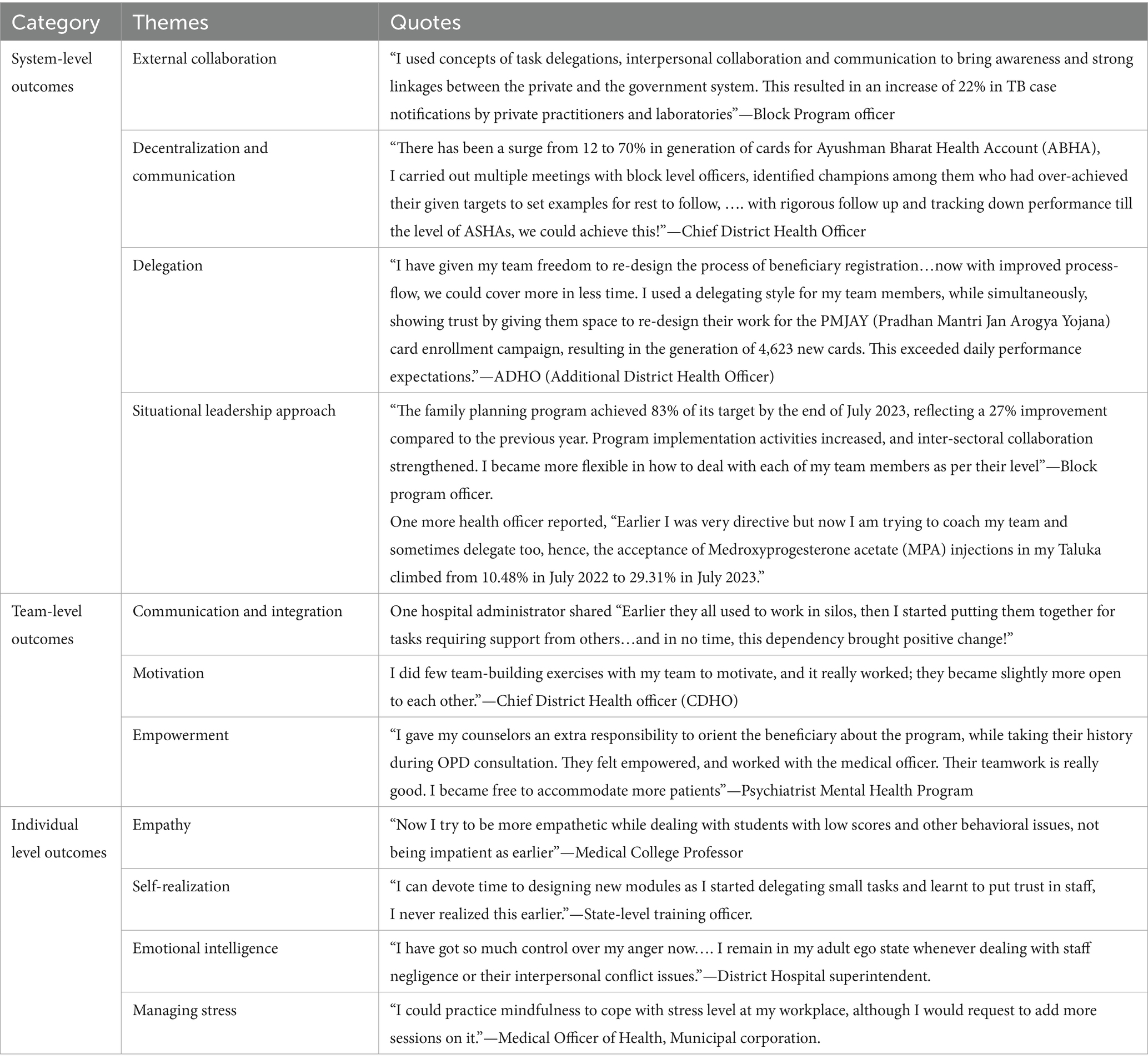 In a few team-level interventions, participants facilitated team discussions which later resulted in the formation of closely knit groups with shared interests, where individuals freely expressed new ideas. Participants noted that providing financial and technical support significantly enhanced team performance. It granted them greater autonomy in implementing program activities, and teams made decisions collaboratively. At the individual level, change primarily manifested as behavioral adjustments and a shift in leadership style. Several participants chose to focus on personal interventions, such as managing anger, practicing mindfulness, and reflecting on their leadership approach. While participants did not report major system-level interventions—such as changes in policies, rules, or procedures—they did initiate minor system-level improvements within their sphere of influence, which yielded positive outcomes.