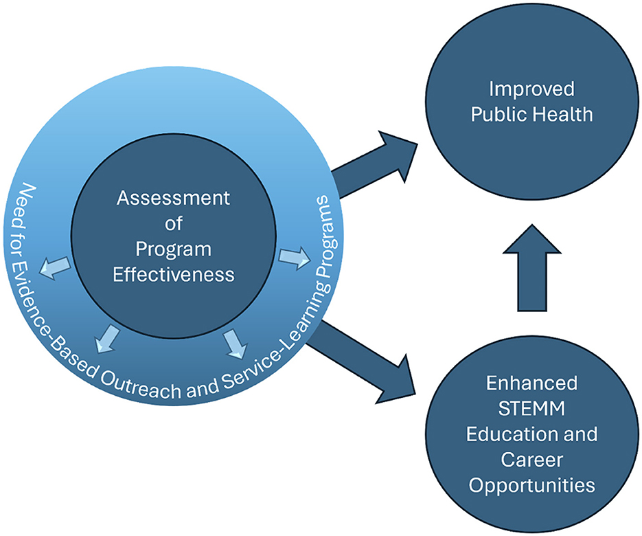 There is a critical need to apply a scholarly approach to the development, implementation, and programmatic assessment of outreach and service-learning programs, followed by intentional dissemination of these programs and their outcomes so that the field can generate evidence-based best practices in outreach and service-learning. To help fill this gap, we created the Research Topic “Evidence-based outreach/service-learning to improve health-related self-efficacy through STEMM education” in Frontiers in Public Health. As Guest Editors for this Research Topic, we are delighted to present the collection of innovative articles comprising this Research Topic. This Research Topic unites diverse research that leverages science, technology, engineering, math, and medicine (STEMM) education and community engagement to empower both individuals and communities while enhancing public health. This editorial summarizes the papers within the Research Topic, exploring four key themes, each highlighting a critical aspect of how evidence-based outreach and service-learning programs enhance health literacy, promote equity, and inspire the next generation of health professionals (Figure 1).