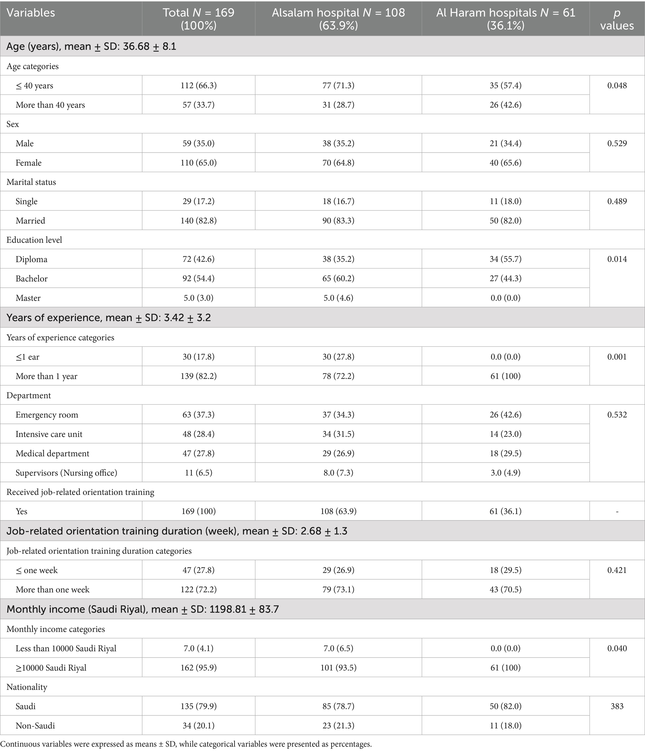 A total of 169 nurses participated in the final analysis, with 108 (63.9%) from Alsalam Hospital and 61 (36.1%) from Al Haram Hospital. Among them, 59 (35.0%) were male and 110 (65.0%) were female. The average age of participants was 36.68 ± 8.1 years. A majority, 112 (66.3%), were 40 years old or younger. Regarding marital status, 140 (82.8%) were married. More than half of the nurses, 92 (54.4%), held a bachelor’s degree in nursing, while only 5 (3.0%) had a master’s degree. The average work experience was 3.42 ± 3.2 years, with 139 (82.2%) having more than 1 year of experience. In terms of department distribution, 63 (37.3%) worked in the emergency room, 48 (28.4%) in the intensive care unit, 47 (27.8%) in the medical department, and 11 (6.5%) served as nursing supervisors in the nursing office. All participating nurses reported receiving job-related orientation training upon employment, with an average duration of 2.68 ± 1.3 weeks. Notably, 122 nurses (72.2%) reported completing more than 1 week of orientation. The mean monthly income was 11,198.81 ± 83.7 Saudi Riyals, with the vast majority, 162 (95.9%), earning more than 10,000 Saudi Riyals per month. Most participants were Saudi nationals (135; 79.9%), while 34 (20.1%) were non-Saudi. Statistically significant differences were observed between the two hospitals in terms of age categories, education level, years of experience, and monthly income (all with p-values < 0.05), as detailed in Table 1.