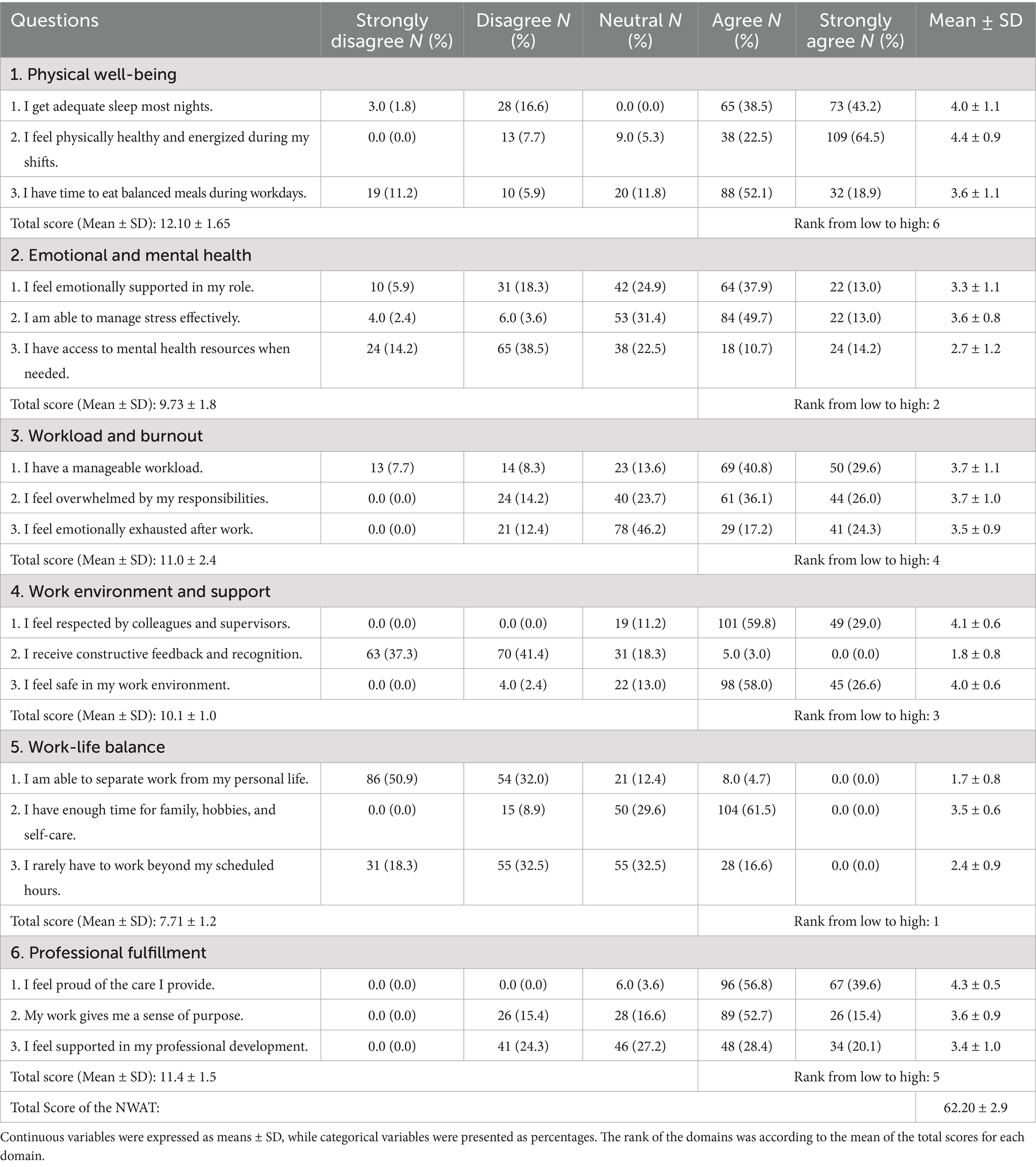 Table 2 presents the distribution of study participants according to the NWAT scores. The average total NWAT score was 62.20 ± 2.9, reflecting a moderate overall level of well-being among the nurses. When ranking the NWAT domains from lowest to highest scores, the order was: (1) work-life balance, (2) emotional and mental health, (3) work environment and support, (4) workload and burnout, (5) professional fulfillment, and (6) physical well-being. These findings emphasize critical areas needing attention, particularly work-life balance and emotional and mental health, followed by workload management, workplace support, and opportunities for professional growth and physical well-being.