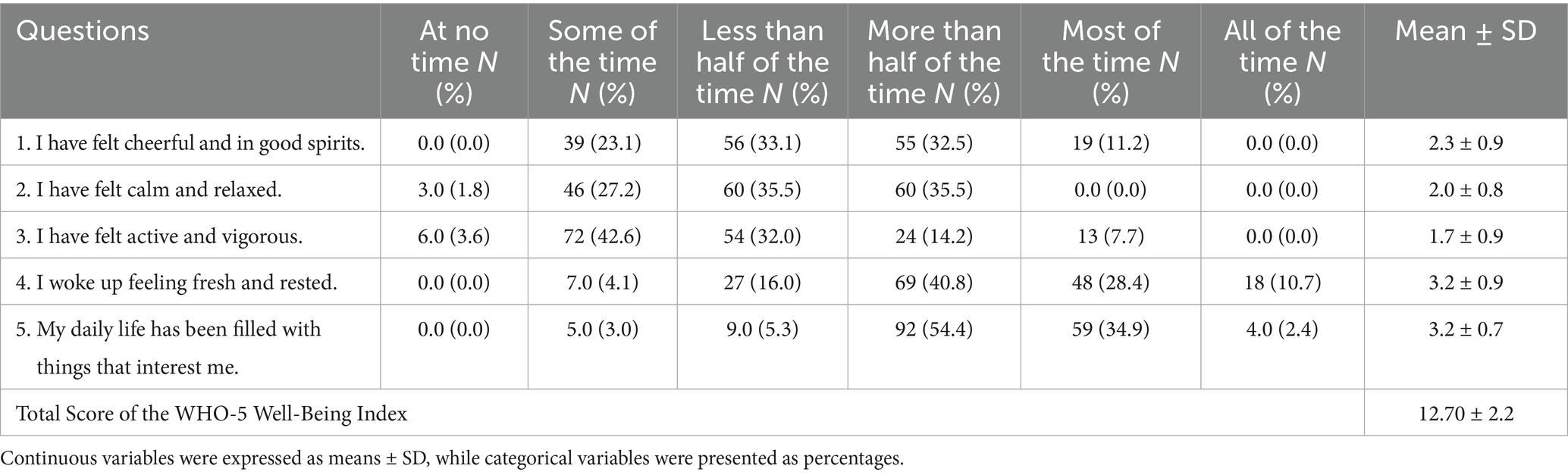 Table 3. Distribution of the study participants according to the world health organization-5 well-being index, (n = 169).